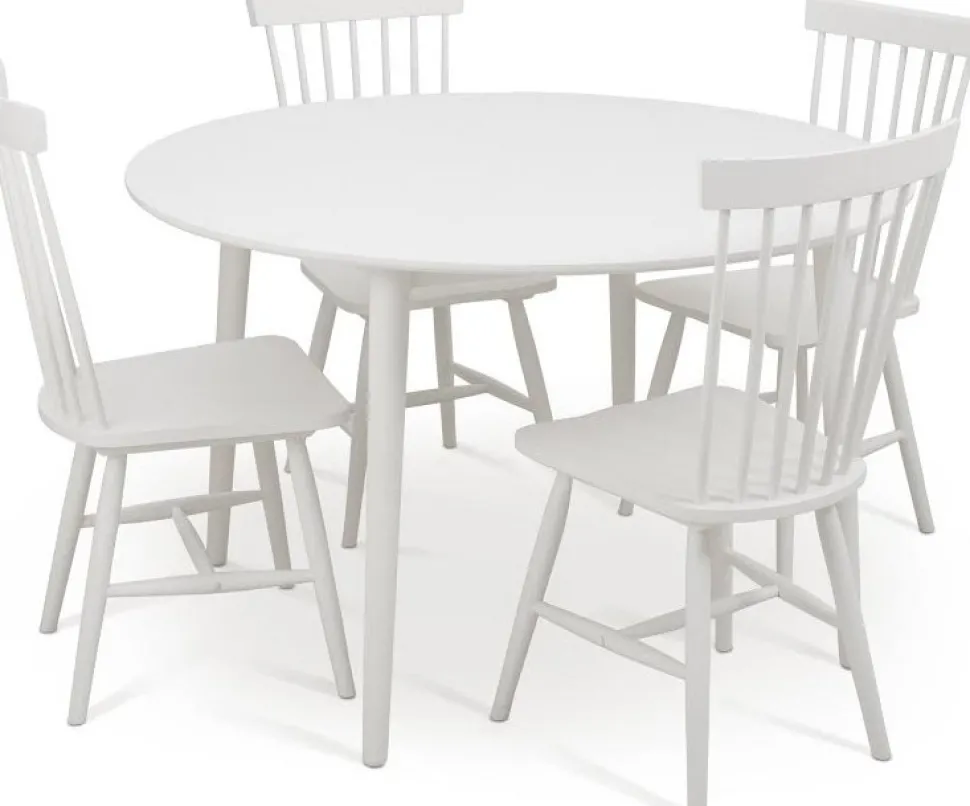 - Matgrupp runt matbord Ø120 cm och 4 vita pinnstolar – Rosvik