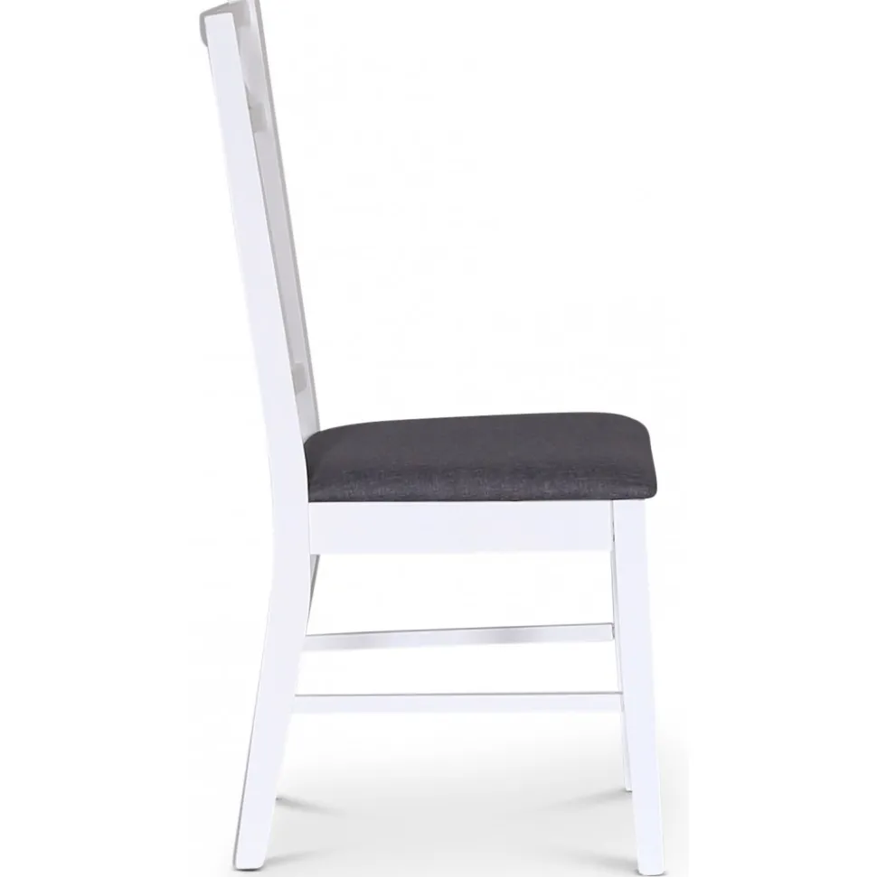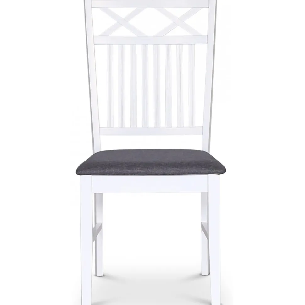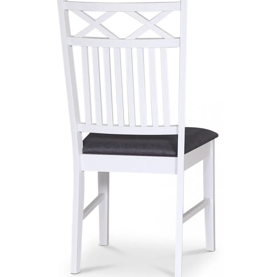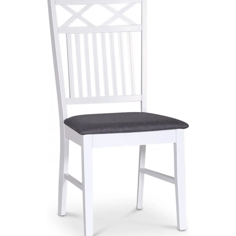 Sandhamn Gripsholm kännetecknas av de vita, klassiska kryssen i ryggens ovankant som ger ett tidlöst och dekorativt uttryck. Sitsen är klädd i grått tyg och stommen är vitlackerad i massivt trä.