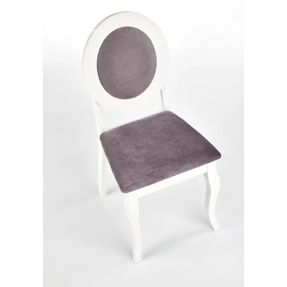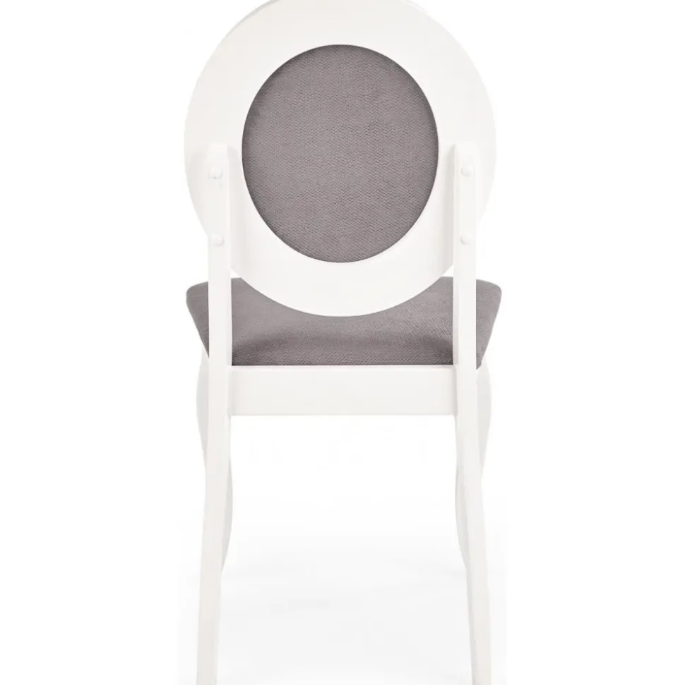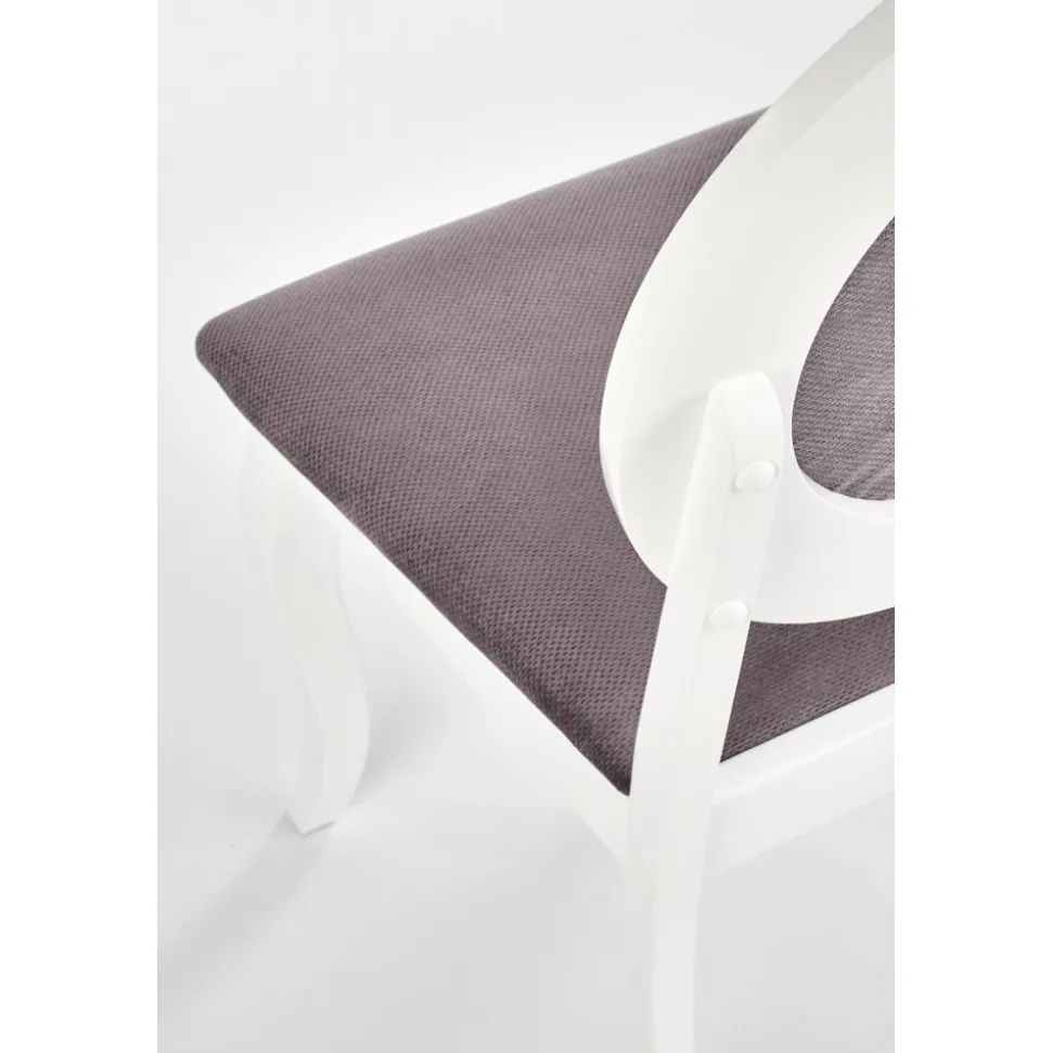 Stolens sits är klädd i ett mjukt och slitstarkt tyg, vilket ger både komfort och hållbarhet. Gummiträstrukturen bidrar till stabilitet och gör stolen hållbar för dagligt bruk. Den ljusa färgkombinationen av vitt och grått ger ett fräscht och ljust intryck, vilket kan lyfta hela rummet.