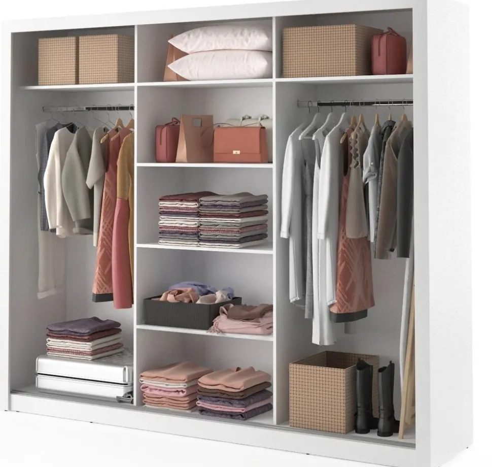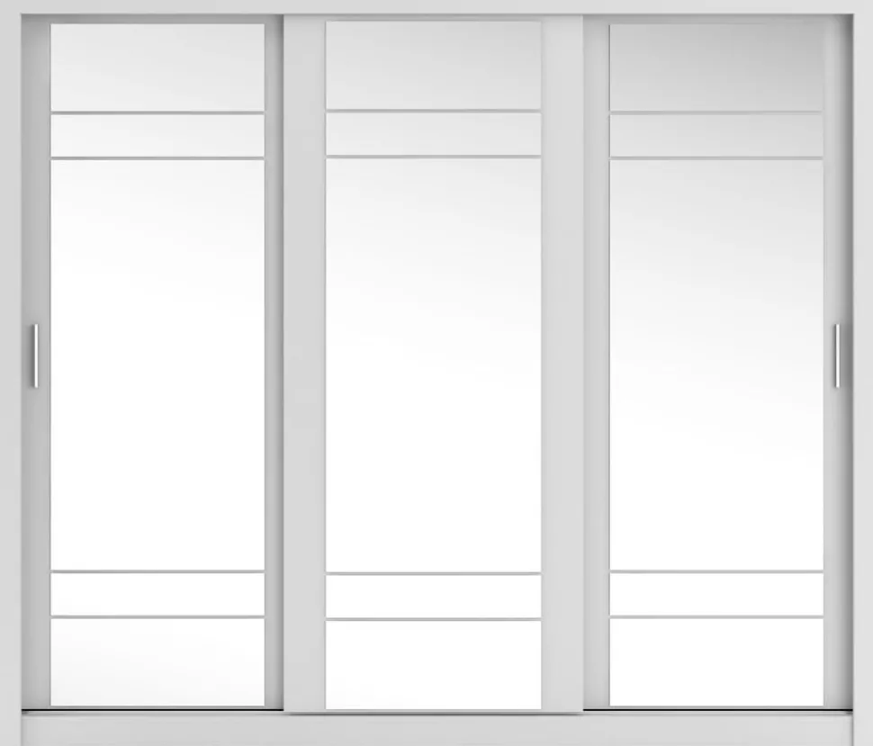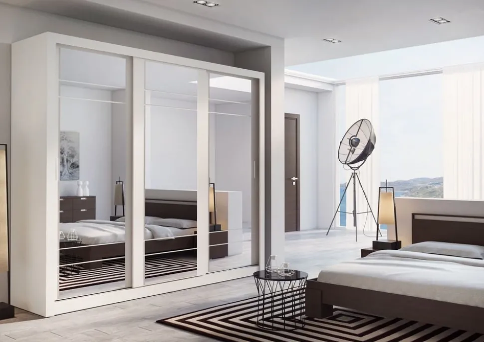 En snygg och mycket rymlig med en modern design. Tillverkad i Chipboard och med många förvaringsmöjligheter. Bakom de tre skjutdörrarna med speglar, finner du massa med utrymme, klädstång och hyllplan. Handtag av plast med blank finish. Levereras omonterad.