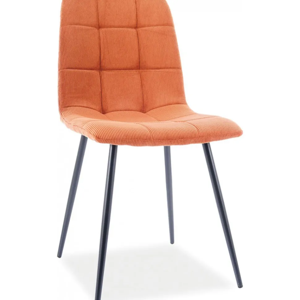 Matstol av metall. Klädd med polyestertyg.