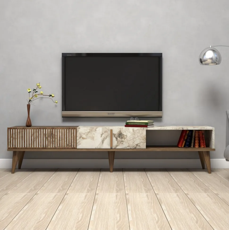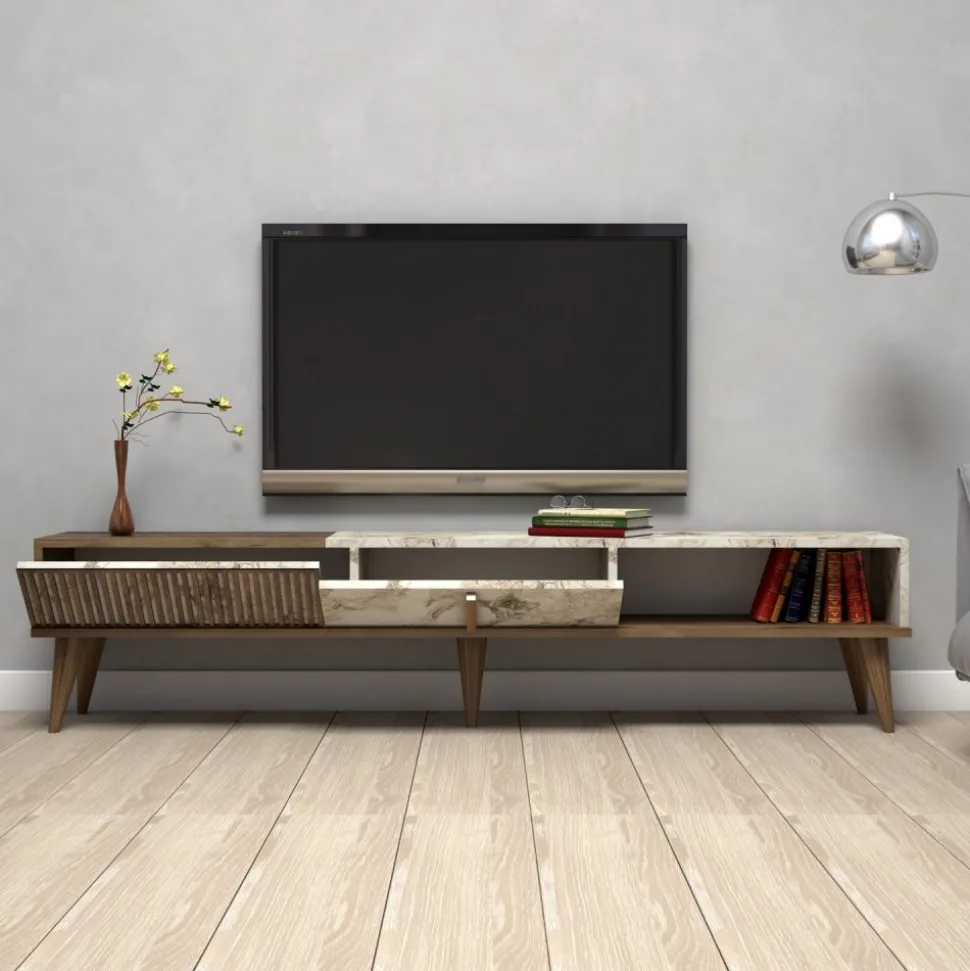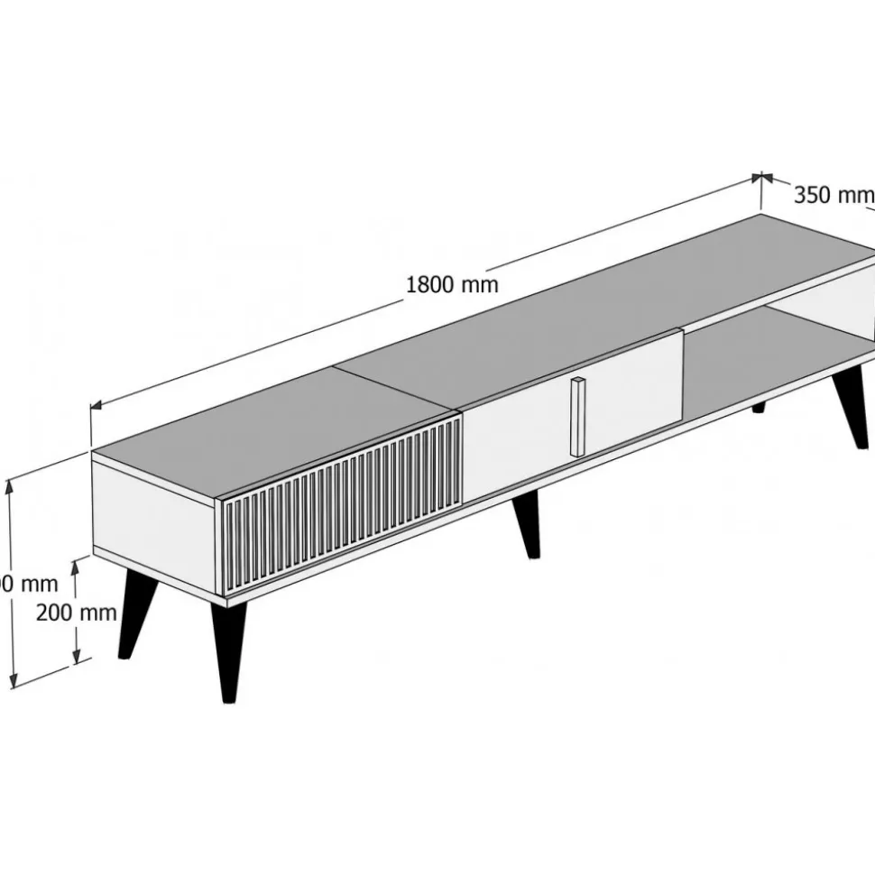 Mediabänk av melaminbelagd spånskiva och ben av plast.