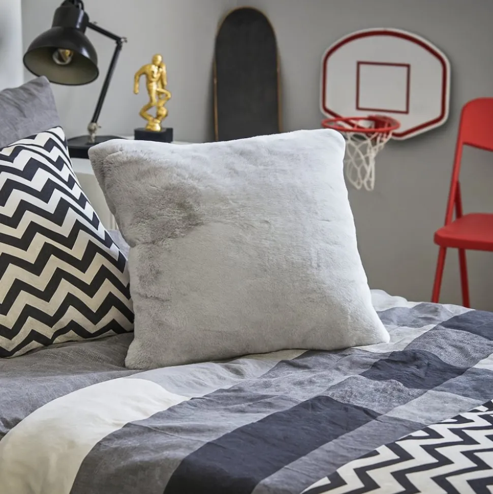 Ge rummet en mysig och inbjudande känsla med detta mjuka i pälsliknande material. Den ljusgrå färgen är lätt att matcha med olika inredningsstilar och passar lika bra i soffan som i sängen. Perfekt för att skapa en varm och ombonad känsla i ett barn- eller tonårsrum där komfort och stil går hand i hand.