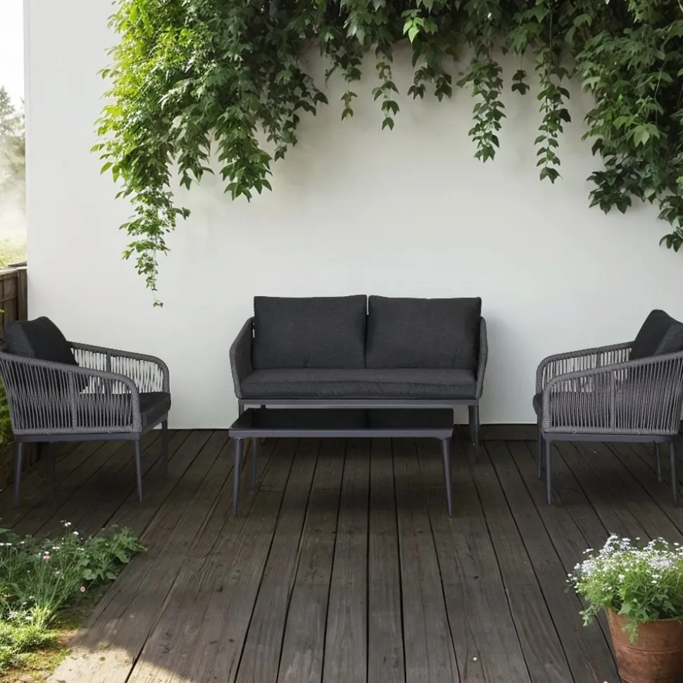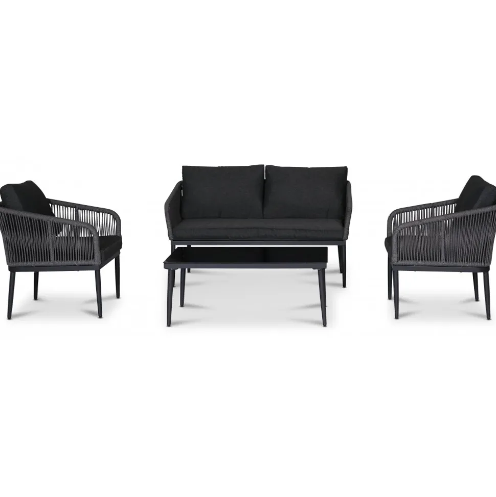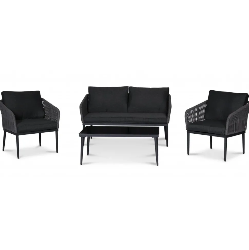 Molde för uteplatsen, bestående utav soffa, 2 st fåtöljer samt bord. Tillverkad av grå rep med hållbar stomme av aluminium. Matchande grå dynor samt ett svart bord med toppskiva av glas. En nätt men ändå rymlig loungegrupp att njuta i.