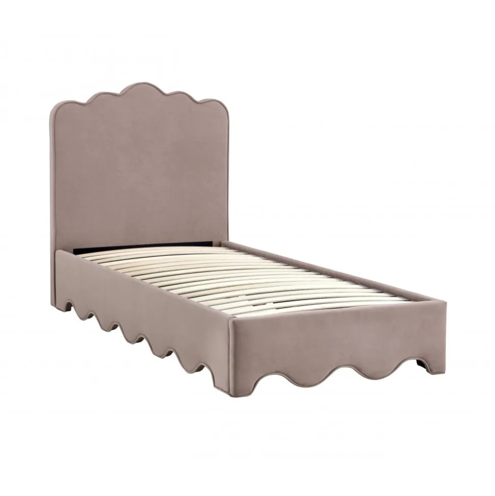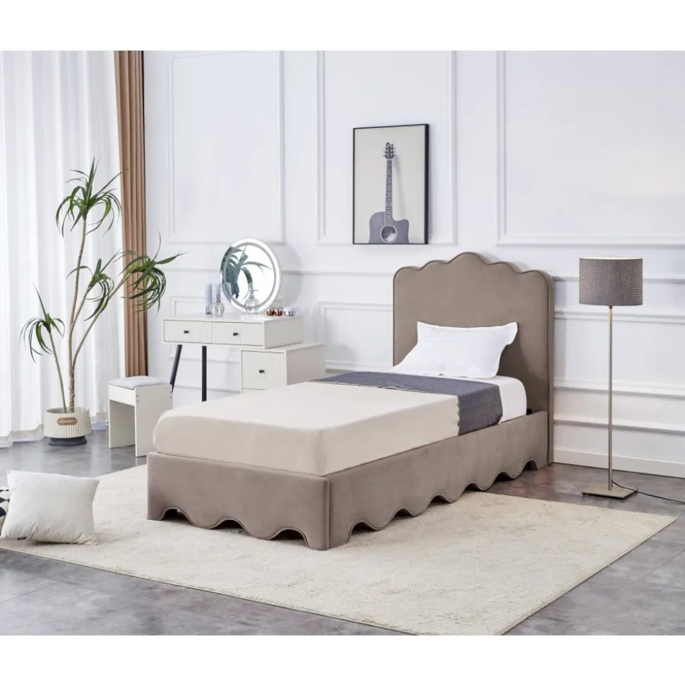 Sängram i mörkbeige sammetstyg. Madrass ingår ej. Sängram med runda och mjuka former för att ge ett lugnt intryck i sovrummet.