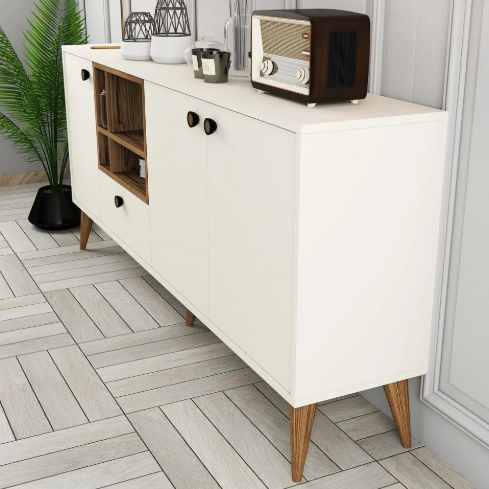 Skänk av trä med ben och handtag av plast.