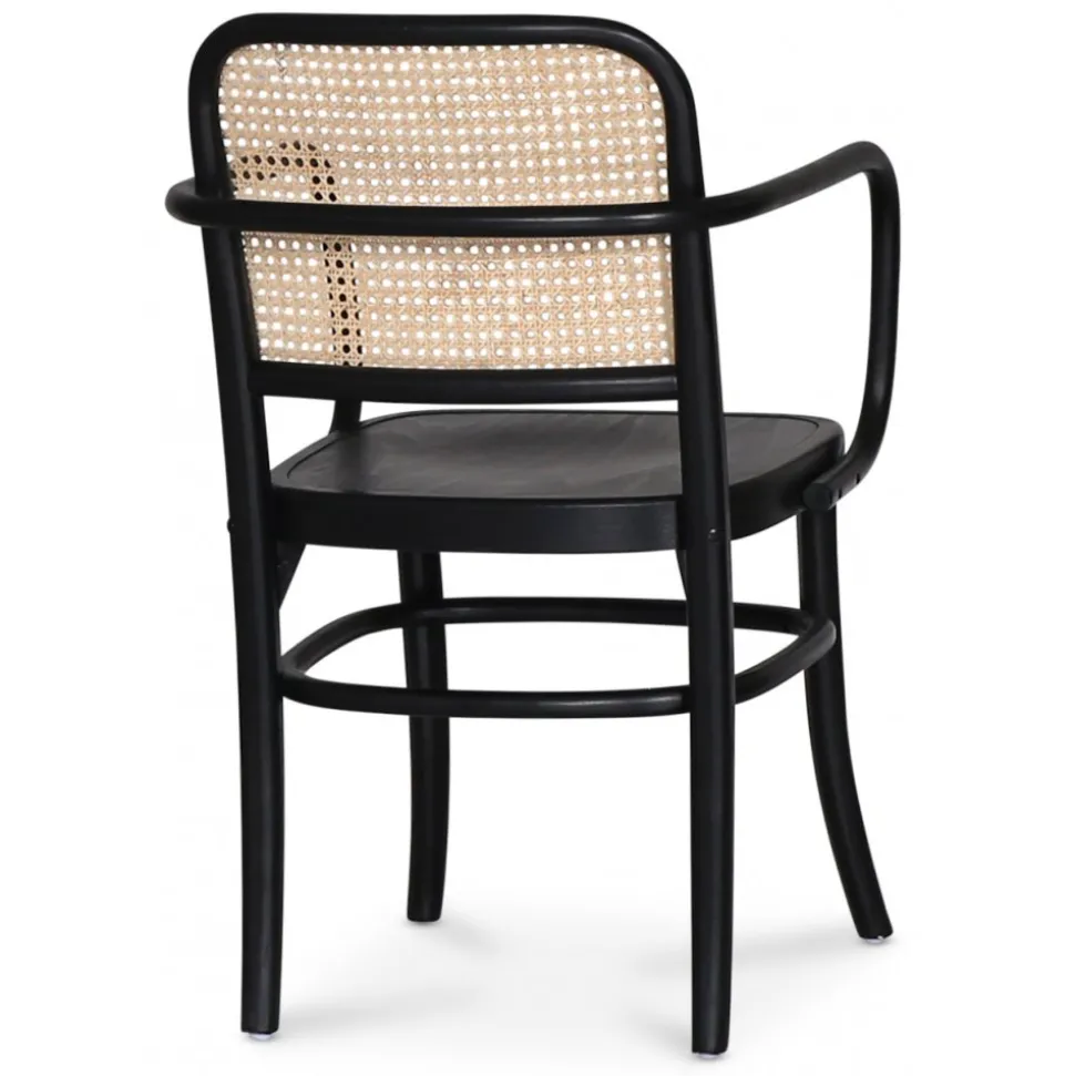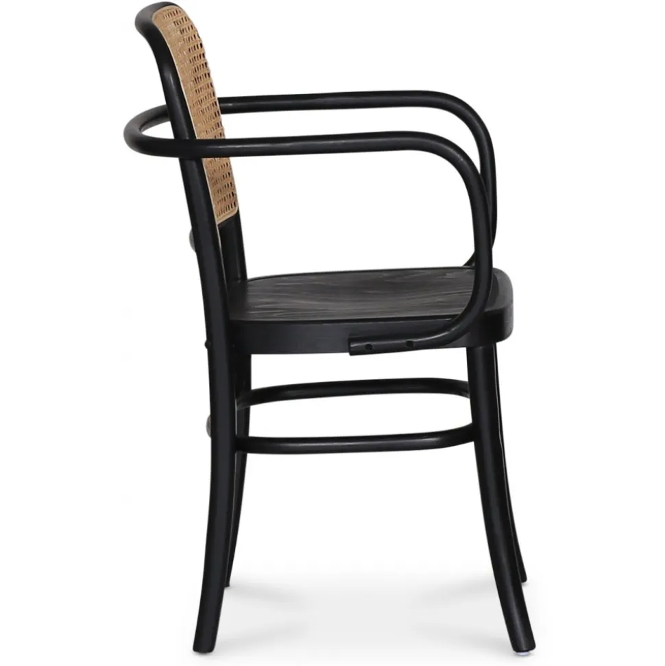 Karmstol med svart stomme av böjträ, tillverkad av bok. Sits i trä och ryggstöd i naturfärgad rotting.