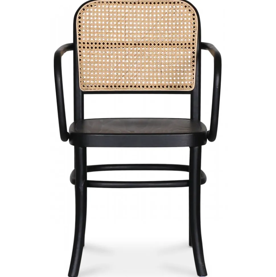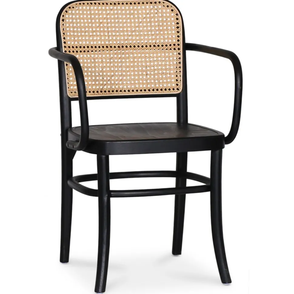 Karmstol med svart stomme av böjträ, tillverkad av bok. Sits i trä och ryggstöd i naturfärgad rotting.