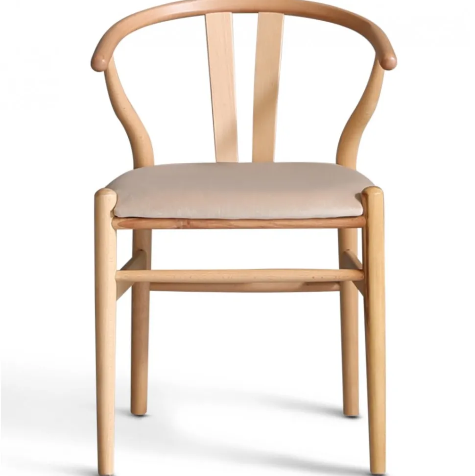 Nemo karmstol i naturfärgad stomme av massiv lackad bok och med beige sammetsdyna. Klassisk som även passar till de moderna borden.