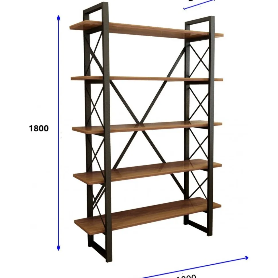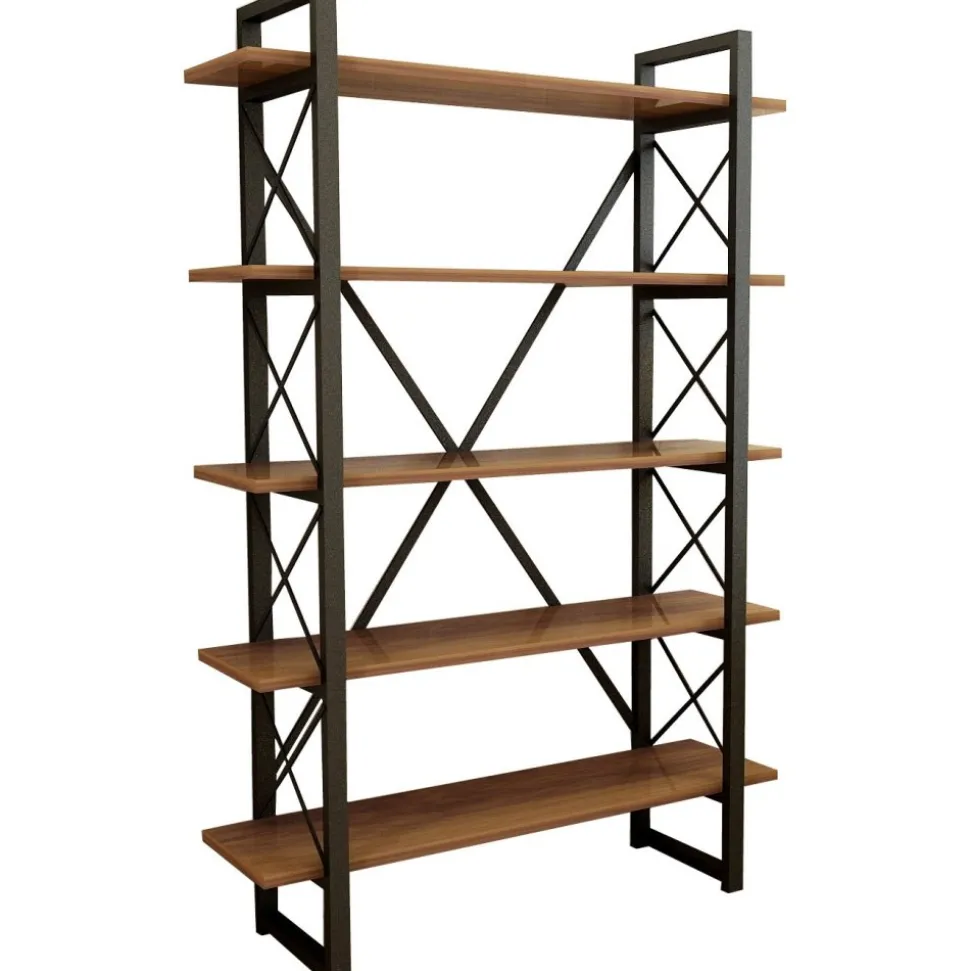 Bokhylla av pulverlackerad metall med hyllplan av melaminbelagd spånskiva.