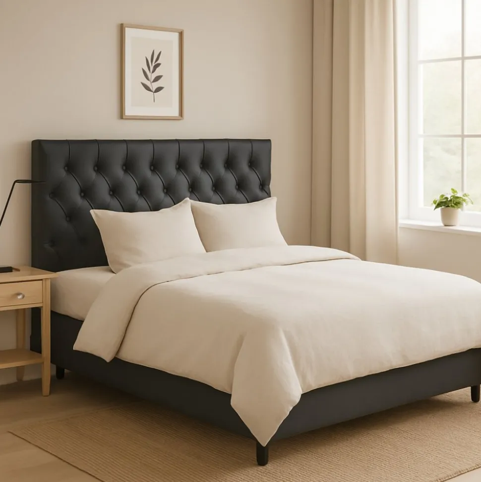 Black Night är en elegant klädd i svart konstläder av högsta kvalitet. Med sina djuphäftade knappar och klassiska design skapar den en känsla av lyx och sofistikerad flärd i sovrummet.