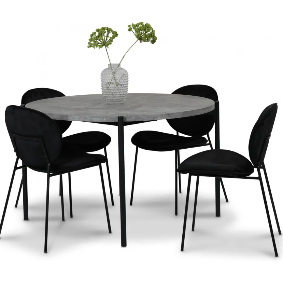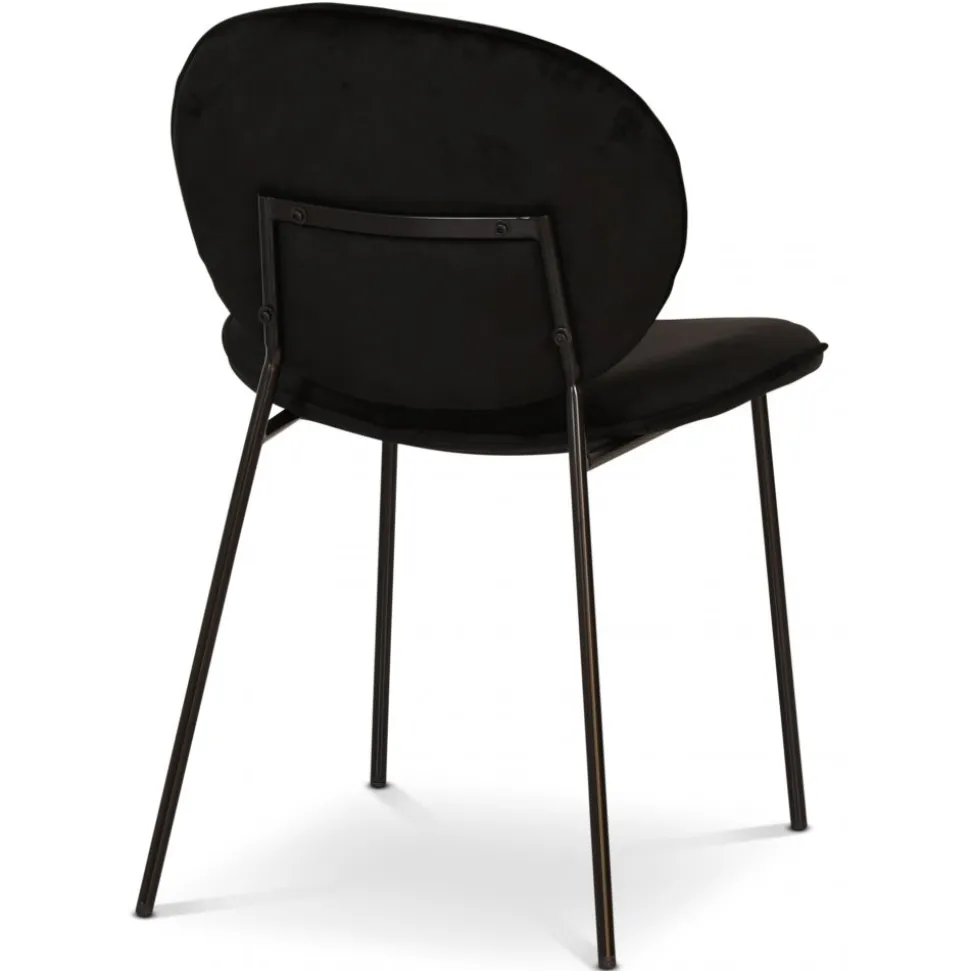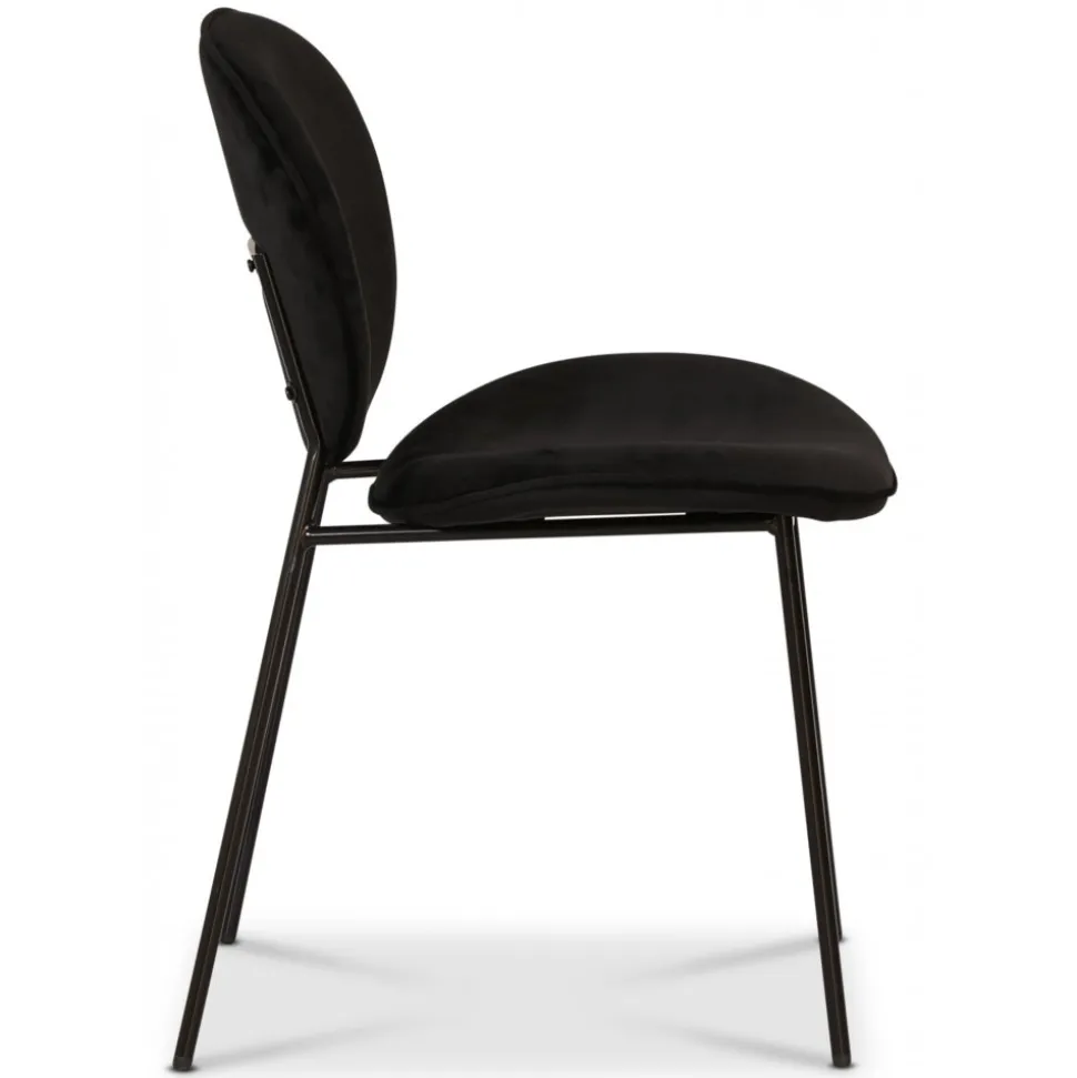 Modern stol klädd i ett svart sammetstyg, svarta ben av metall. Serien innehåller i fler färgkombinationer.