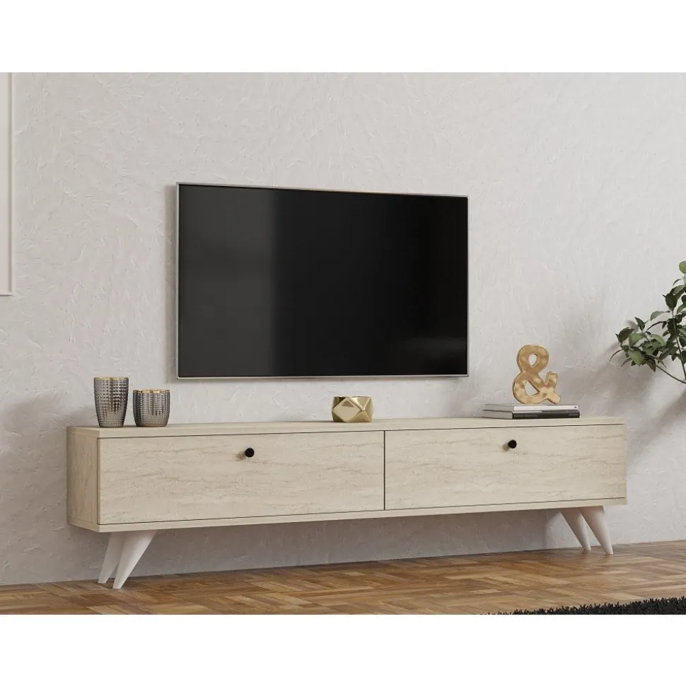 Mediabänk av melaminbelagd spånskiva med ben av plast.