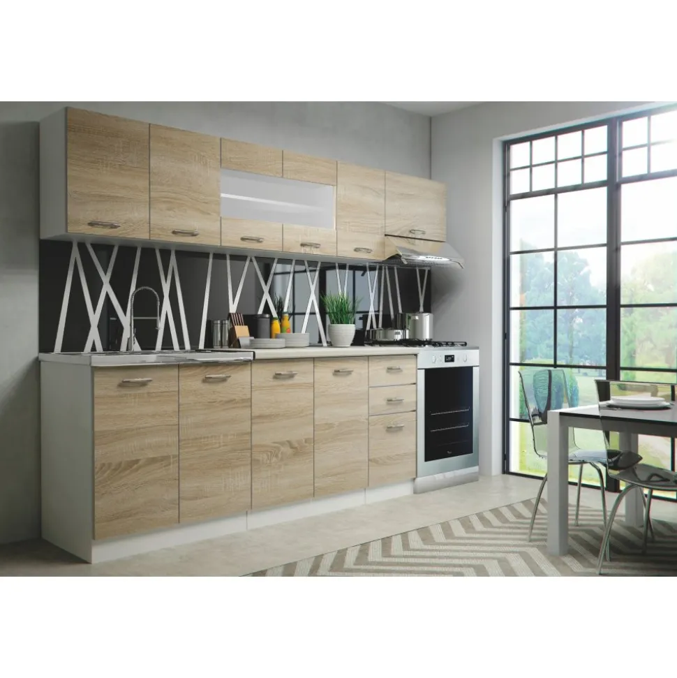 Perla komplett kombinerar boho-stilens avslappnade elegans med funktionalitet och charm. Med en total längd på 260 cm erbjuder detta kök en praktisk och rymlig arbetsyta som passar både vardagsbruk och mer ambitiös matlagning. De naturliga tonerna i sonoma ek, sandfärgad bänkskiva och vit stomme skapar en inbjudande atmosfär som passar perfekt för ett modernt boho-kök.