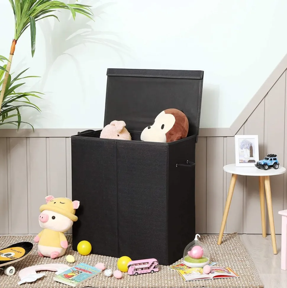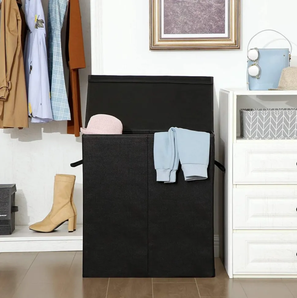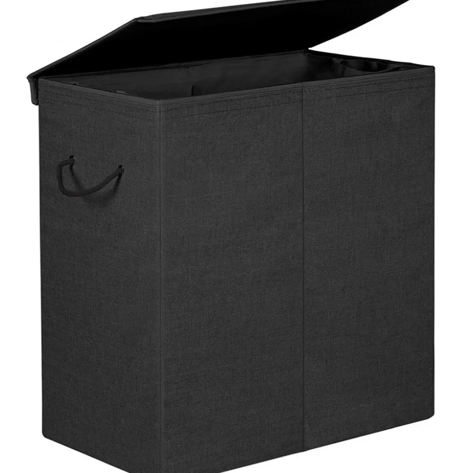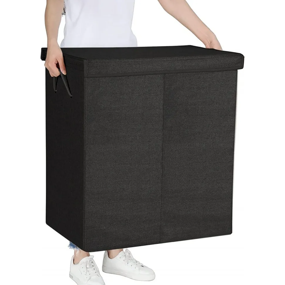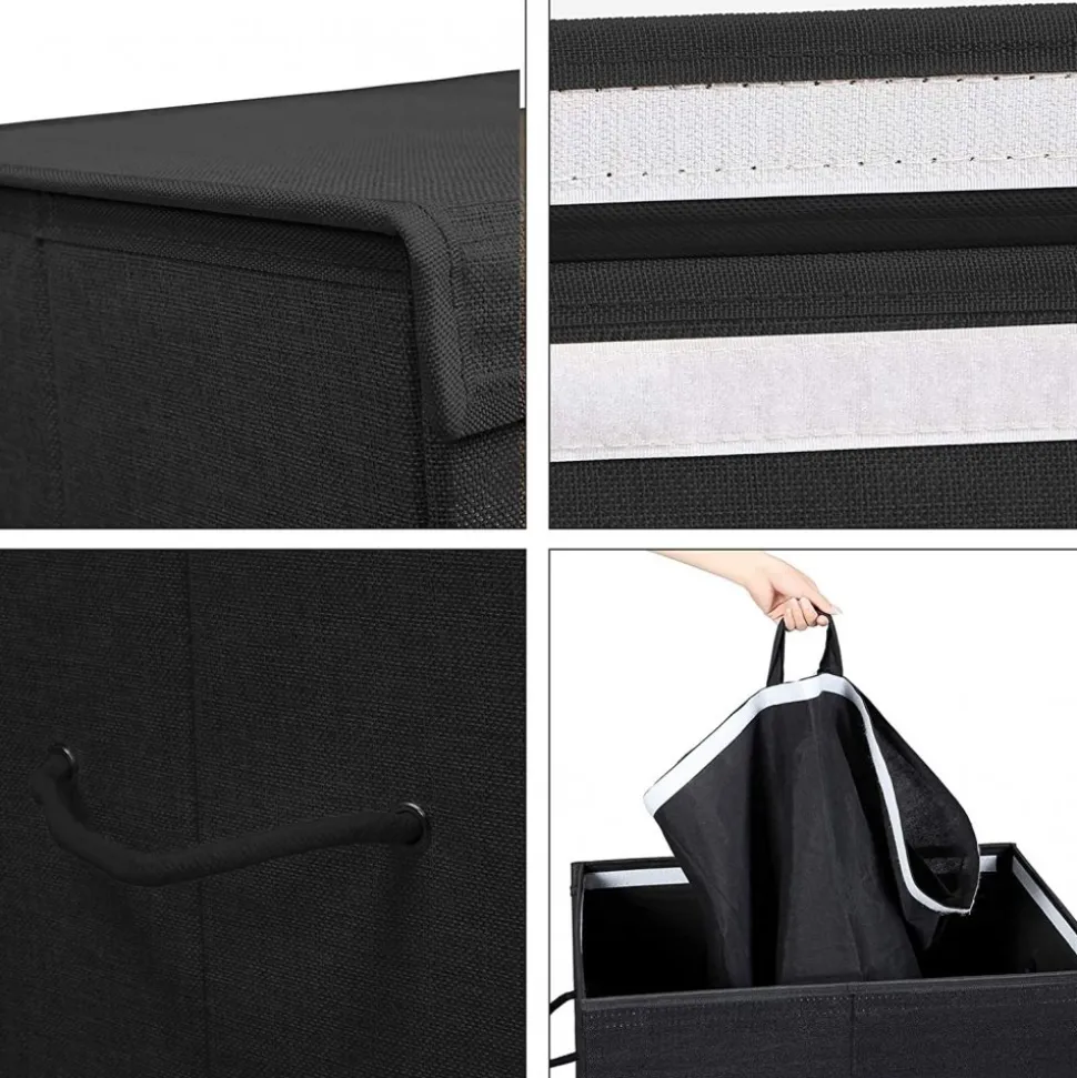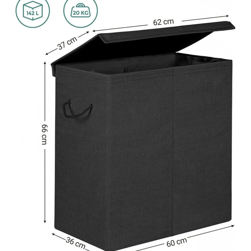 Tvättkorg av trä klädd med bomullstyg. Korgen har 2 separata fack och rymmer 142 liter.