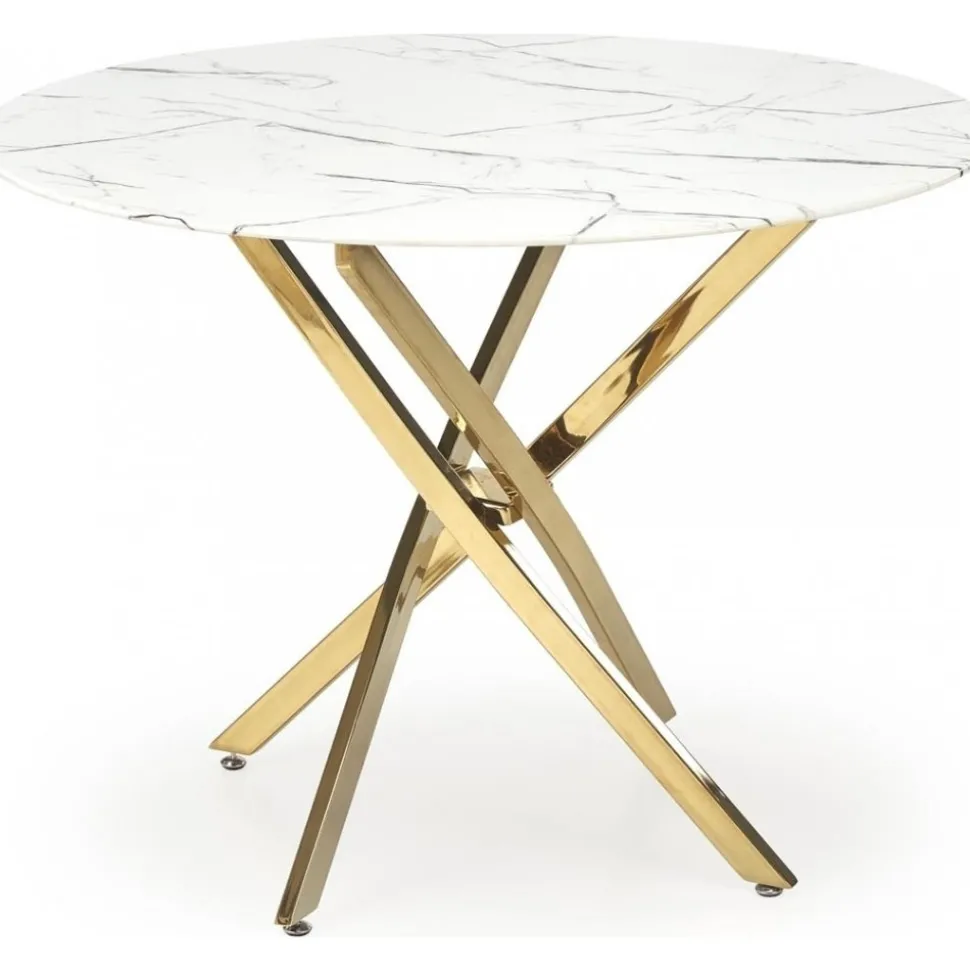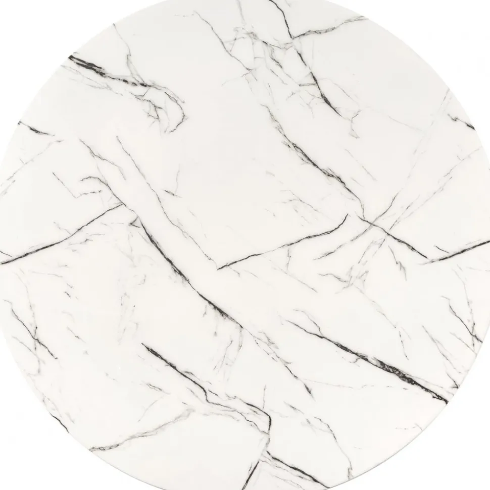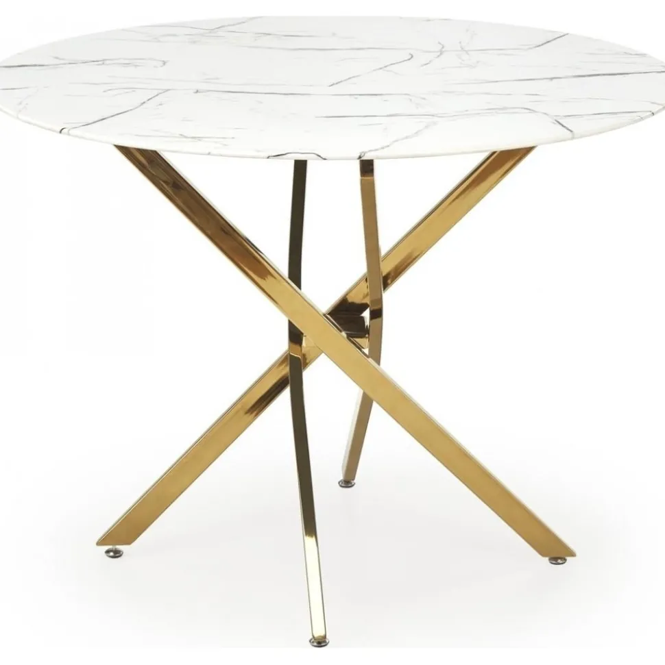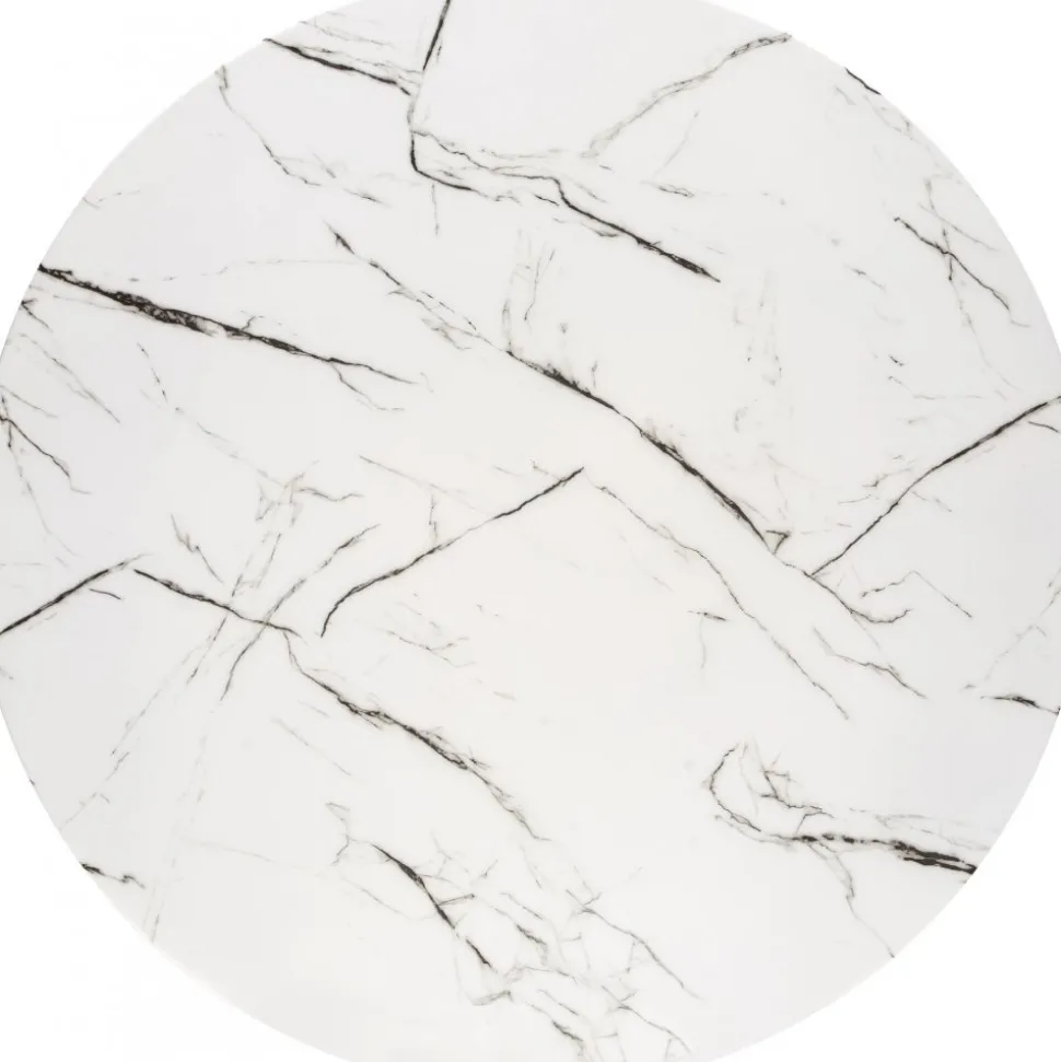 Matbord med bordsskiva av glas med marmoreffekt och underrede av kromat stål.