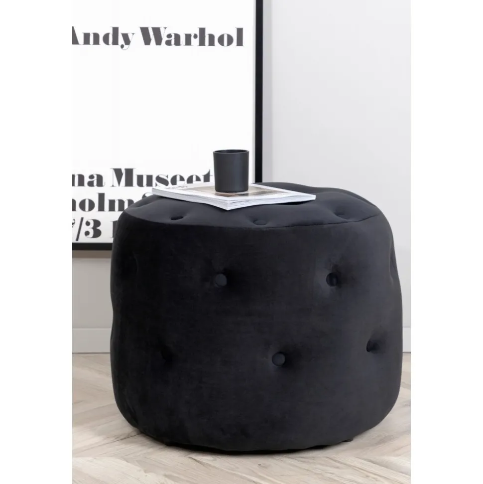 Sittpuff av trä, klädd med polyestertyg.