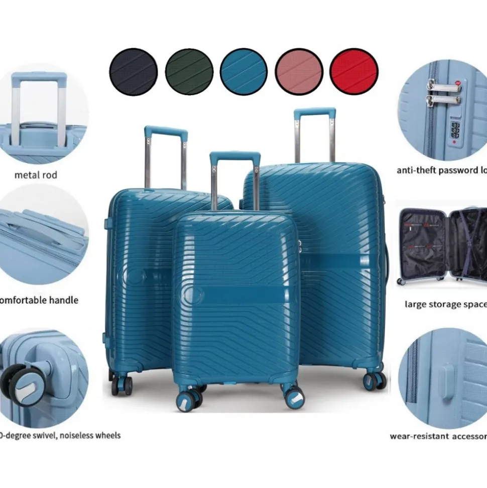 Varje väska är utrustad med ett teleskophandtag av aluminium och plast, vilket gör det enkelt att dra med sig väskan på resan. Alla väskorna har ett inbyggt 3-siffrigt kodlås, vilket ger dig extra trygghet och skydd för dina tillhörigheter under resan. Setet omfattar tre storlekar.