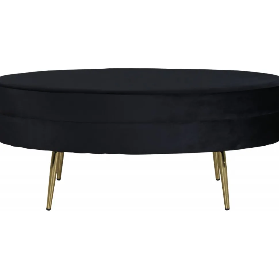 Sittpuff av trä och stål, klädd med polyestertyg.