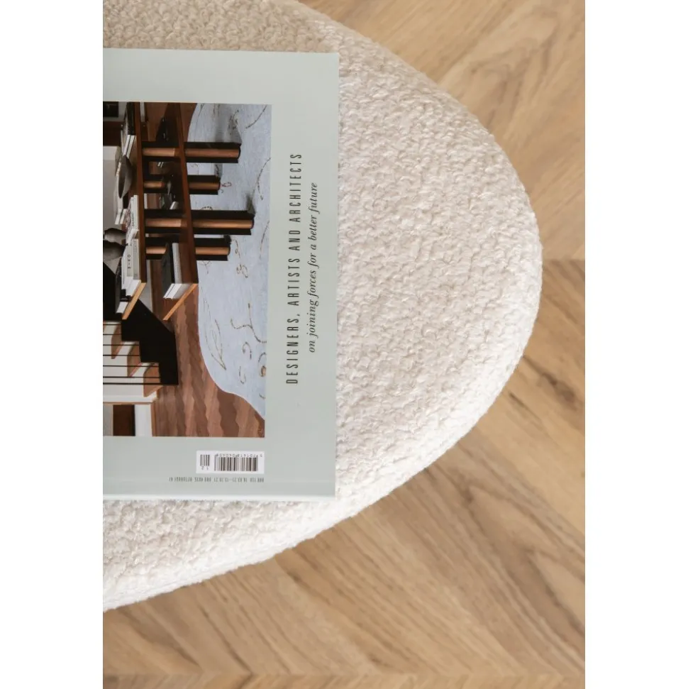 Sittpuff av trä och stål, klädd med polyestertyg.