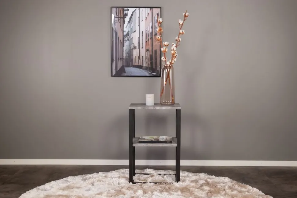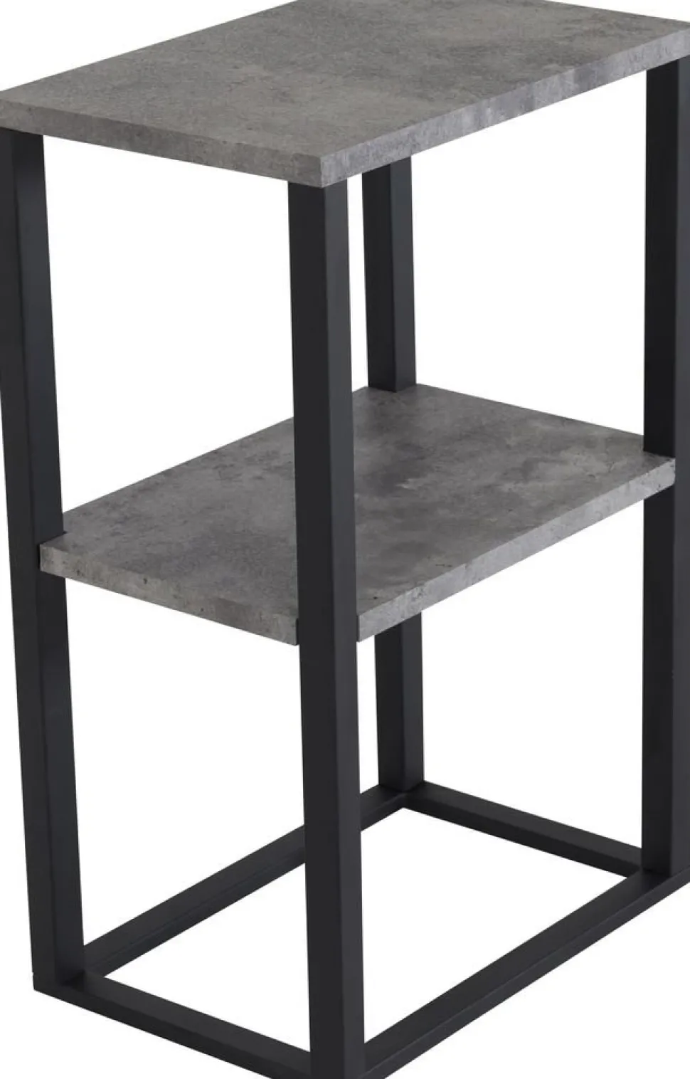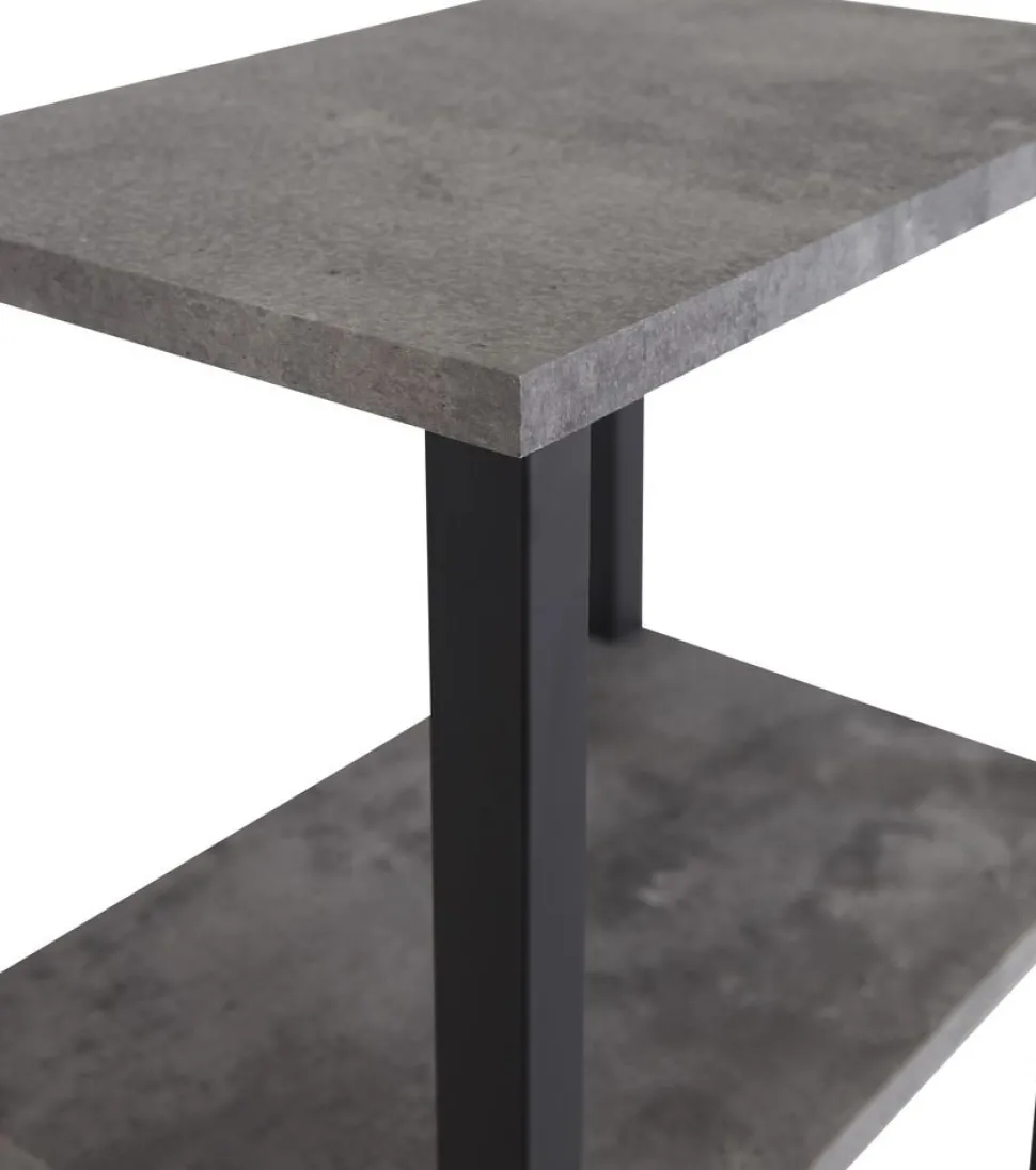 Sängbord Rise med två hyllplan i MDF med betongmönster. Stomme i svart metall. Finns även i teakimitation.