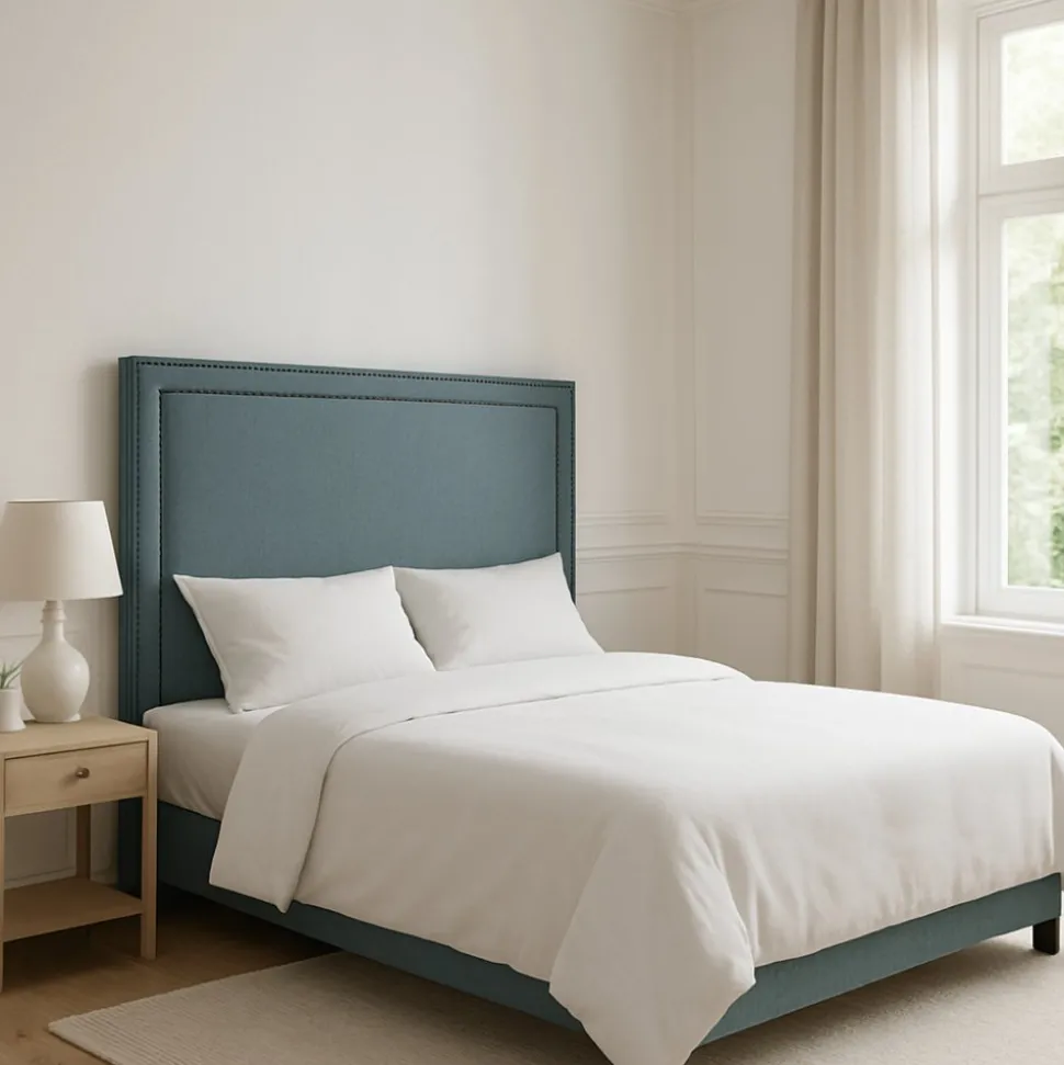 Denna välbyggda och robusta sänggavel står stadigt när den placeras mellan sängen och väggen helt utan behov av montering eller ingrepp i vare sig säng eller vägg. De dekorativa nitarna i old mässing ger designen en sofistikerad och tidlös karaktär.
