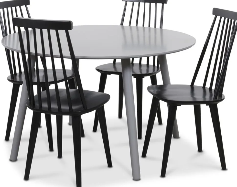 - Rosvik matgrupp grått runt bord med 4 st svarta Dalsland Pinnstolar – Grå / Svarta