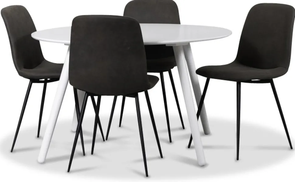 Matgrupp från Skånska Möbelhuset, Rosvik matbord 120 cm i diameter. Medföljer 4 st matchande Smokey matstolar i gråbrunt vintage tyg med svarta ben.