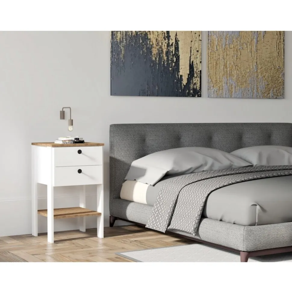 Sängbord av melaminbelagd spånskiva.