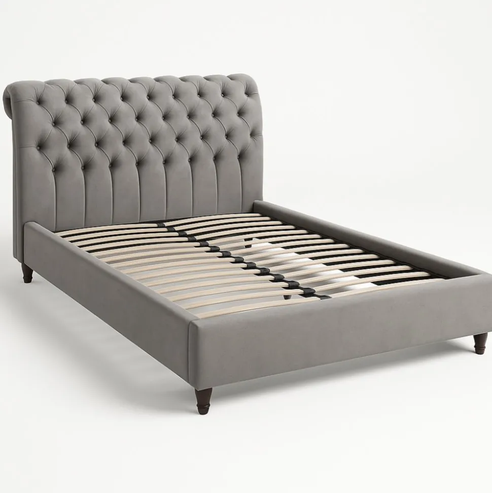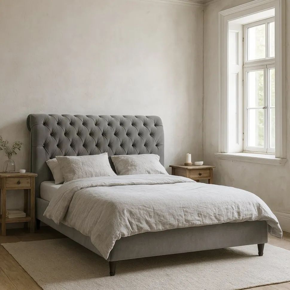Ge ditt sovrum en känsla av tidlös elegans med denna vackra sängram. Den stilrena designen kombinerar klassiska former med modern komfort, och den djuphäftade sänggaveln med knappdetaljer skapar ett exklusivt intryck. Den rundade toppen och det mjuka tyget gör sängen till en naturlig mittpunkt i rummet.