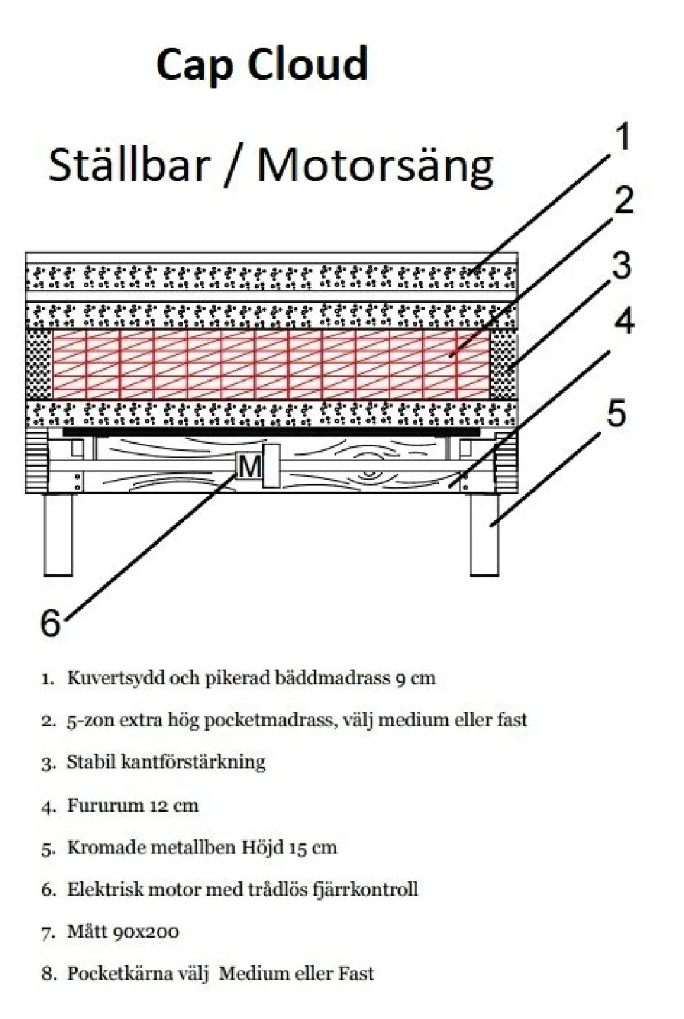 Motorsäng Cap Cloud är en premiumsäng av högsta kvalitet, designad för komfort och lång hållbarhet. Dubbelsängen levereras med en lyxig och bekväm dubbelbäddmadrass i kallskum av hög kvalitet.