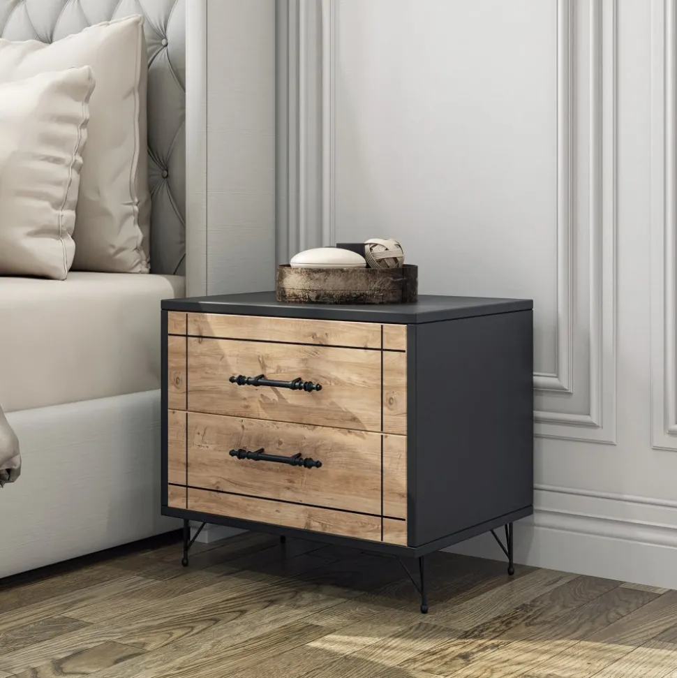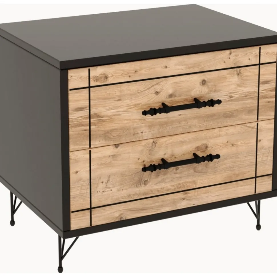 Sängbord av melaminbelagd spånskiva med ben av metall.