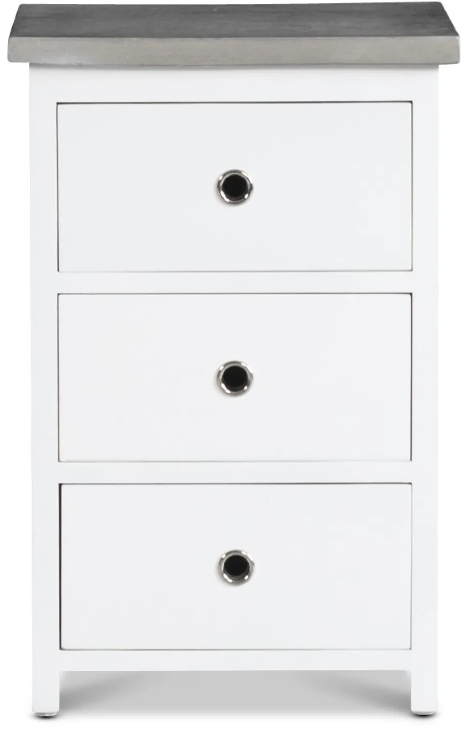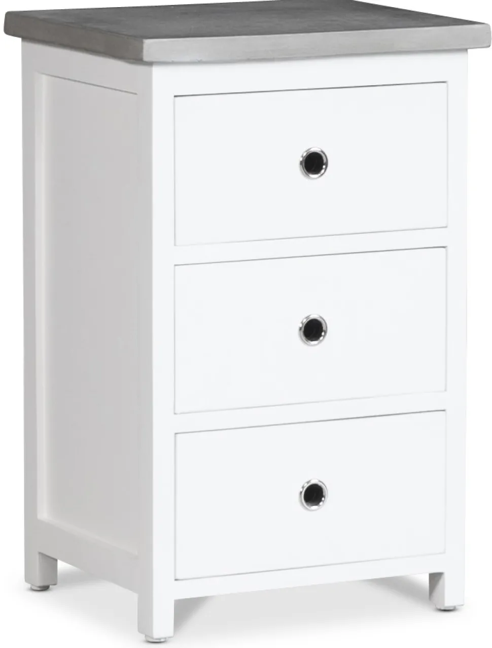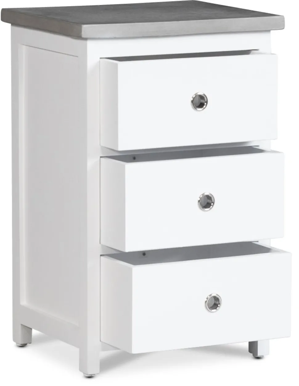 Stilfull sängbyrå i vit mdf med 3 st lådor för praktisk förvaring. Robust design och toppskivan i cement gör den extra tålig.