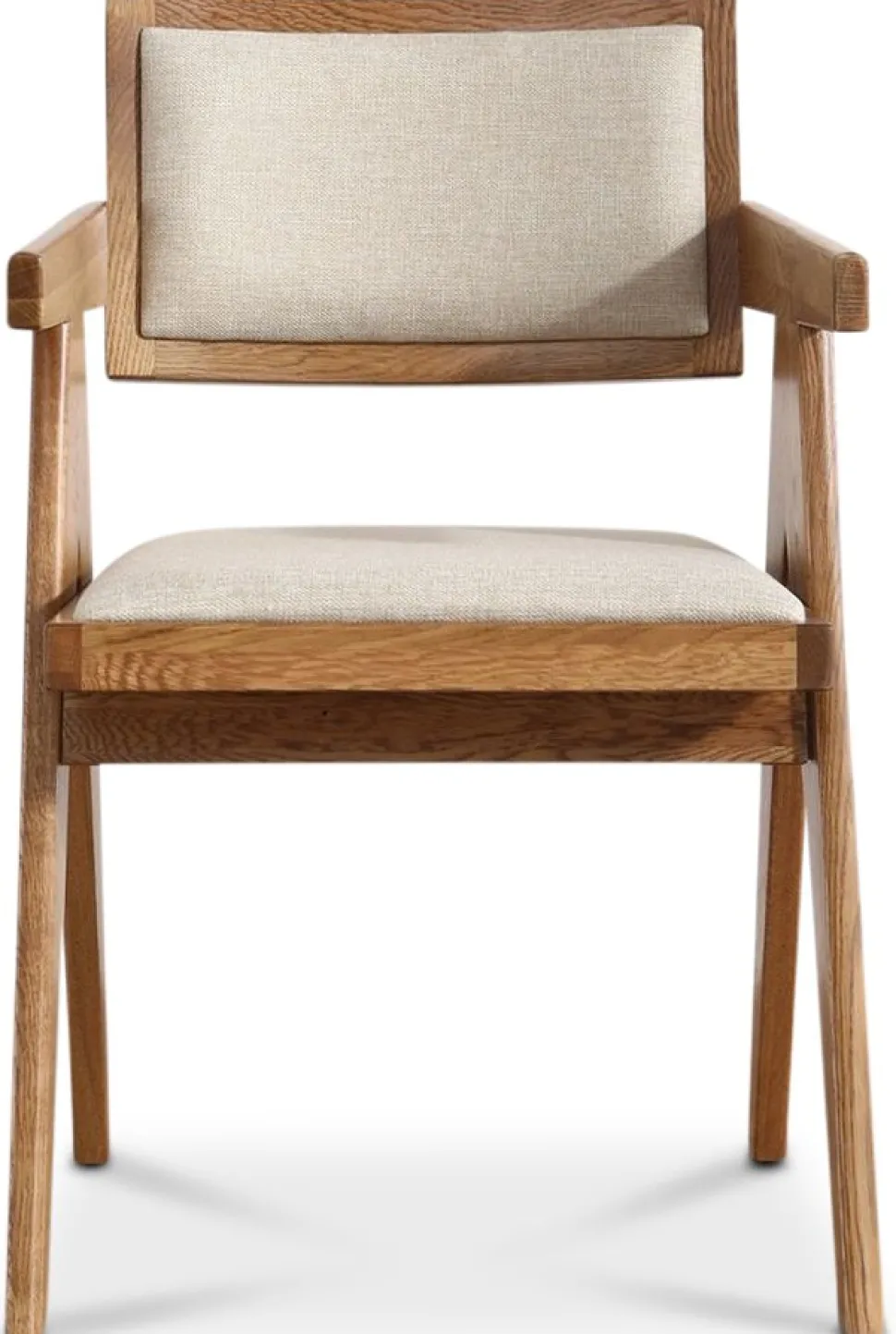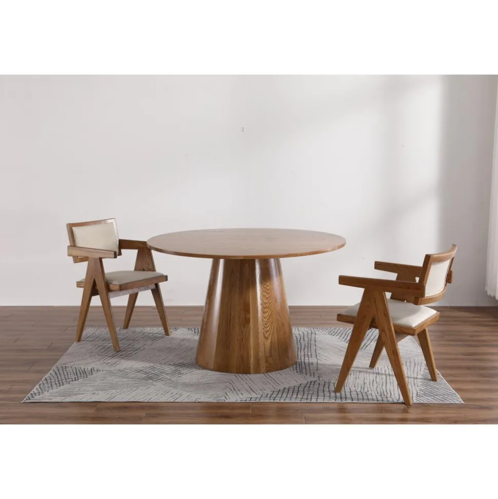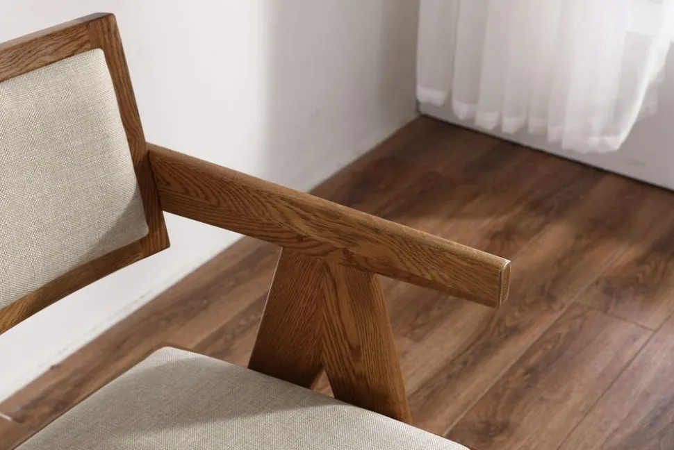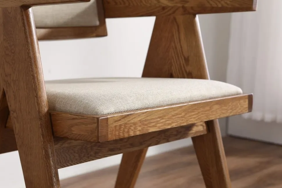 Robust som finns att välja i flera olika färger. Ramen är av ek i utförande valnöt, sits- och rygg klädd med ett grått linnetyg.