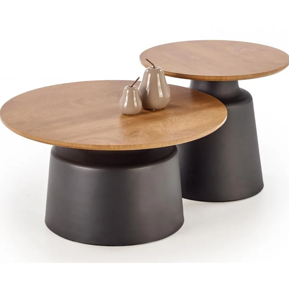 Sattsbord bestående av två i olika storlekar. Satsbord med bordsskiva trä och underrede av pulverlackerad stål.