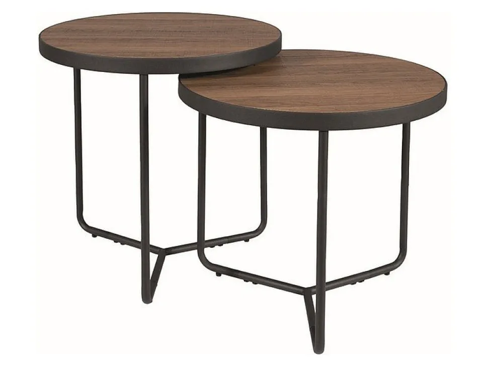 Ett par fina med en vintage design. Borden är tillverkade i svart pulverlackad metall med toppskivor i valnötsfanèr.
