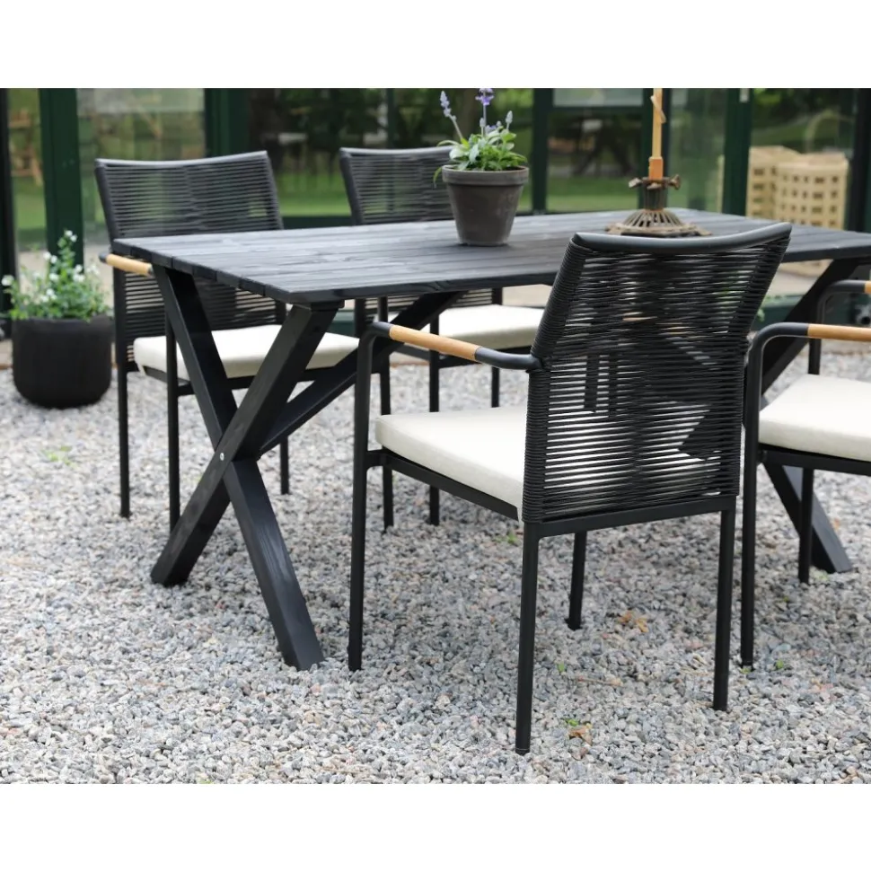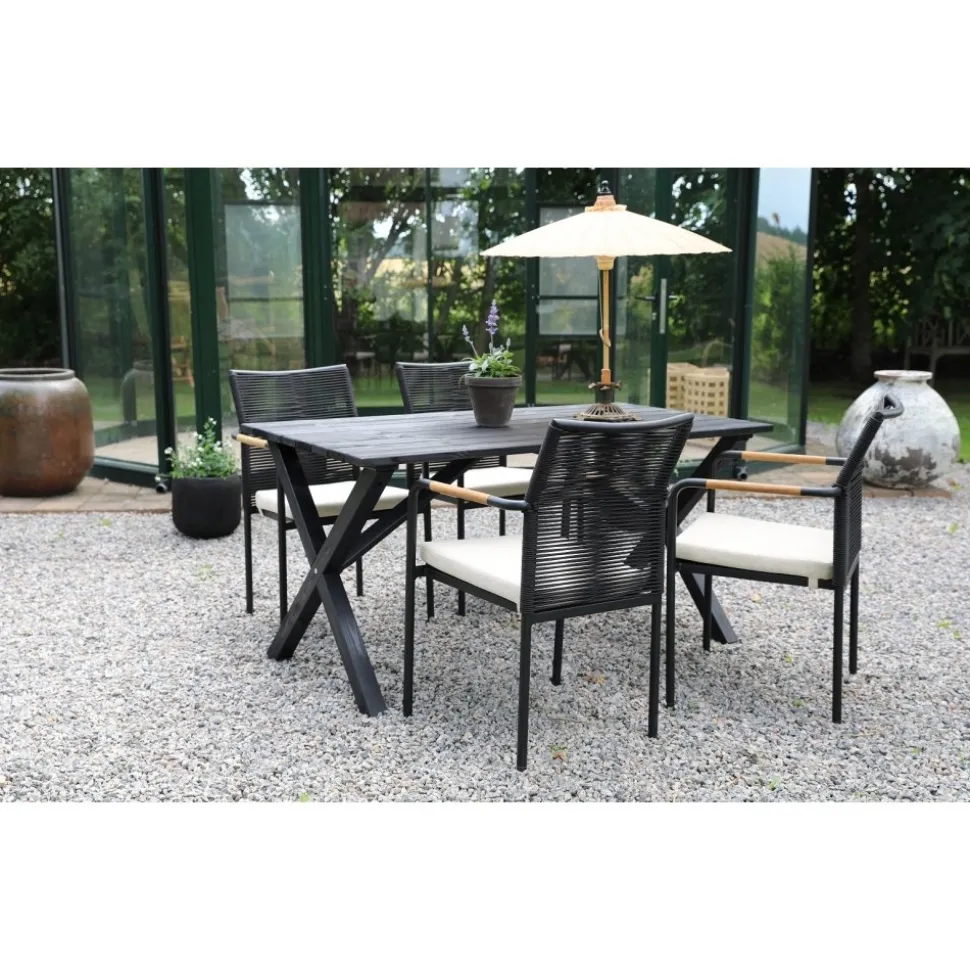 Scottsdale matgrupp för uteplatsen med ett rektangulärt robust matbord, tillsammans med Skanör karmstol med svart rygg i rep och en beige skön sittdyna. Bordet är tillverkad i svartlaserad furu vilket gör utegruppen väderbeständig och tålig för att klara uteplatsens miljö.