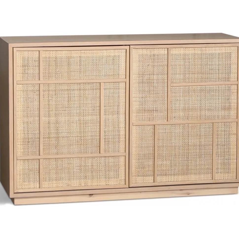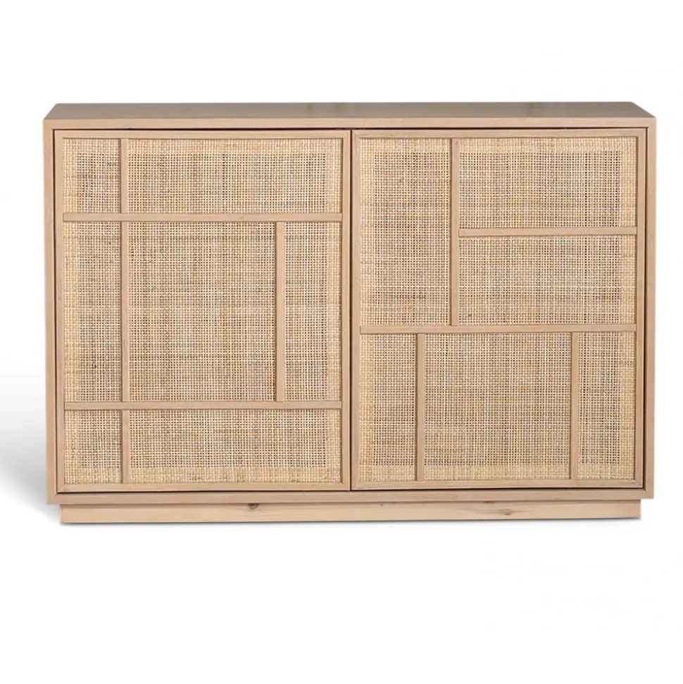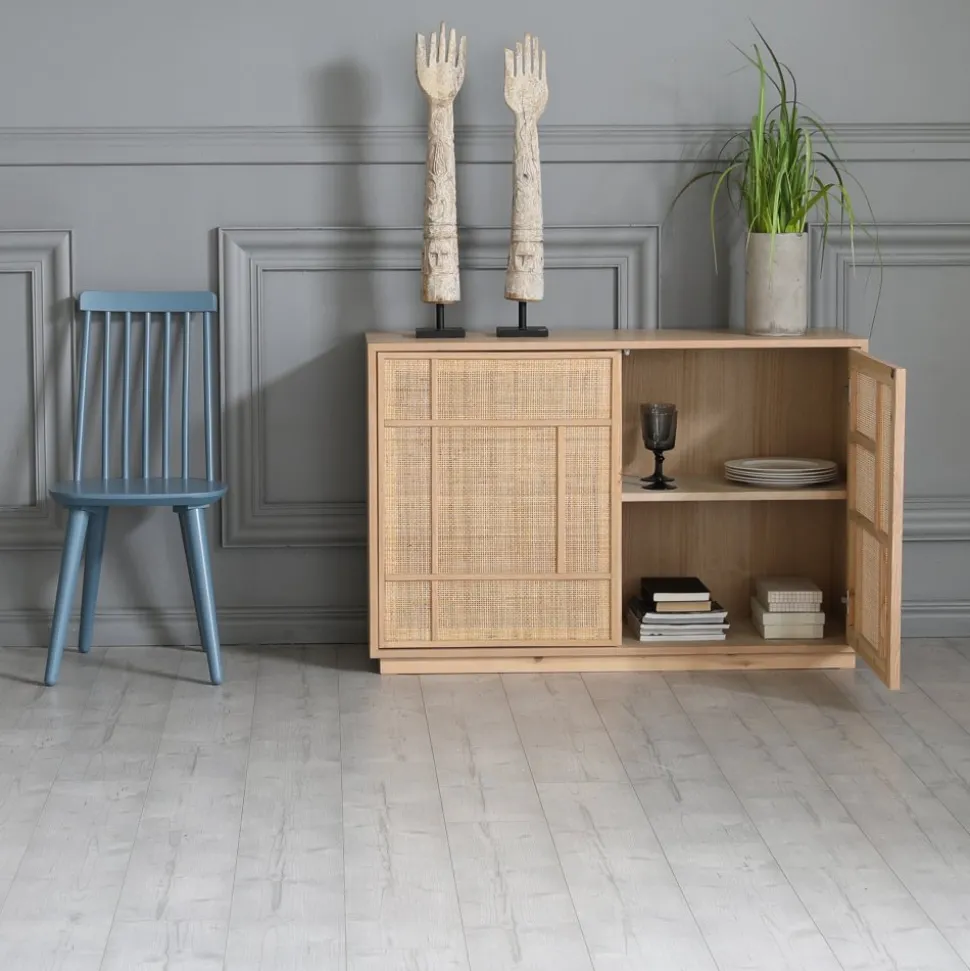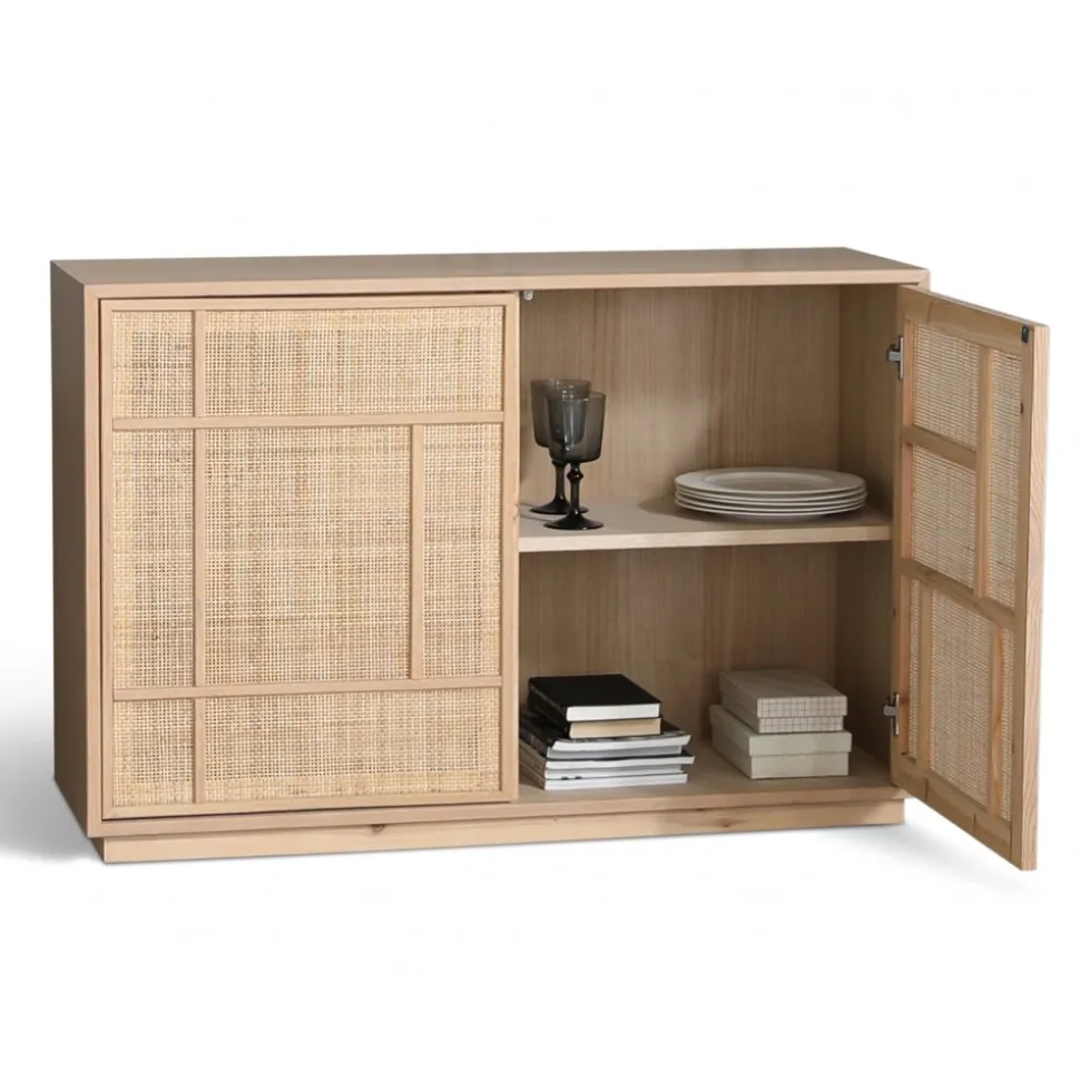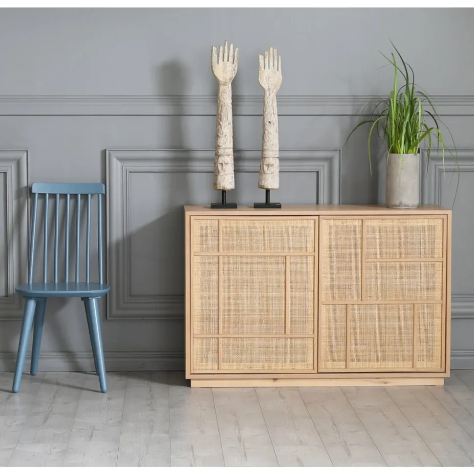 Stockholm i ek med dörrar i rotting. Sideboardet innehåller två stycken fasta hyllplan. Sideboardet har bra förvaringsöjligheter.