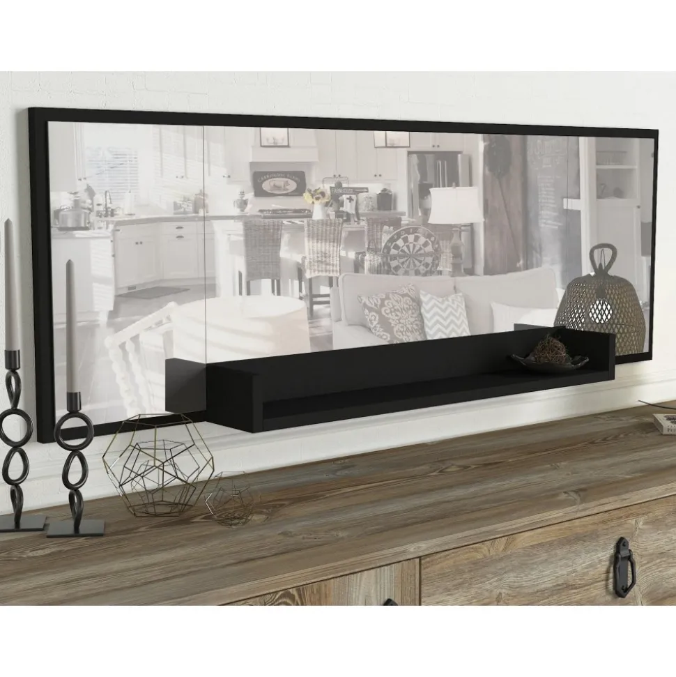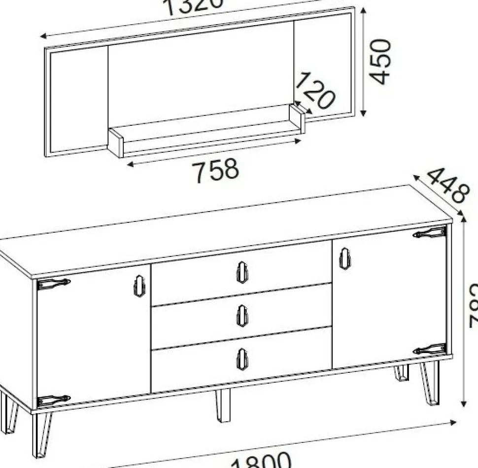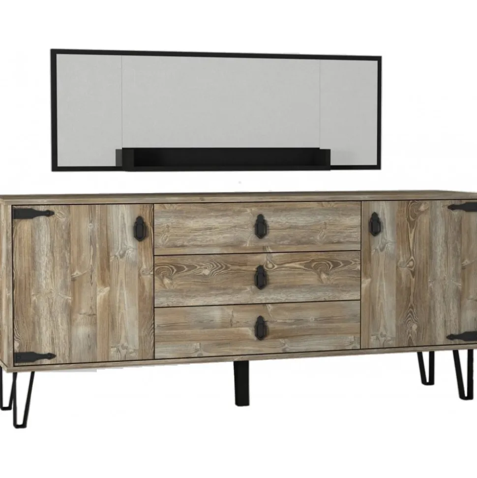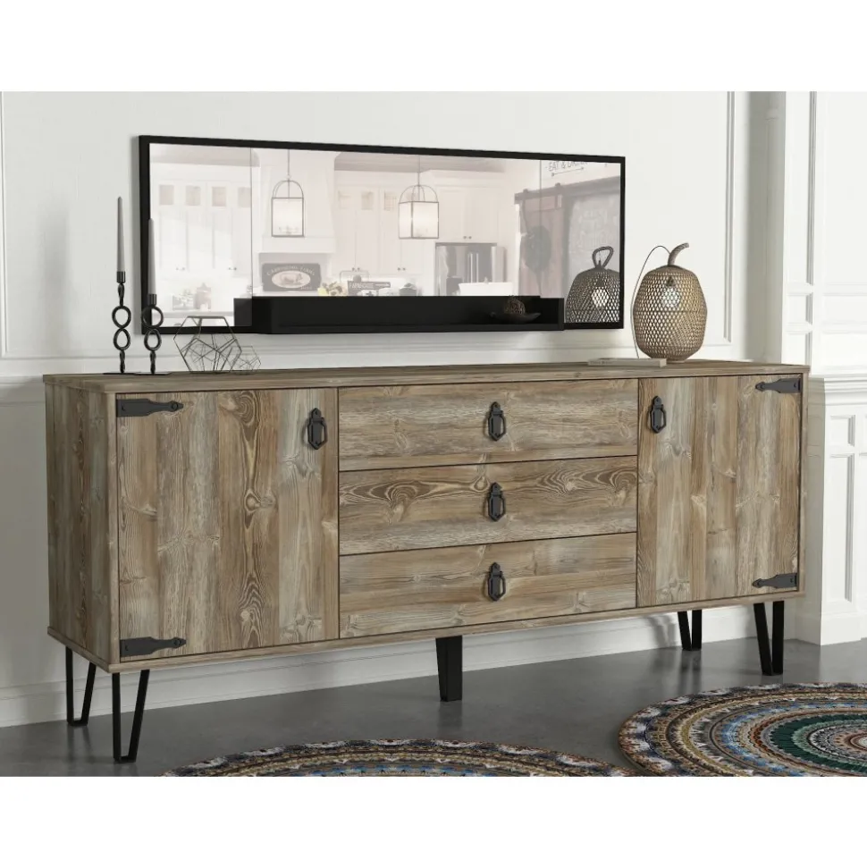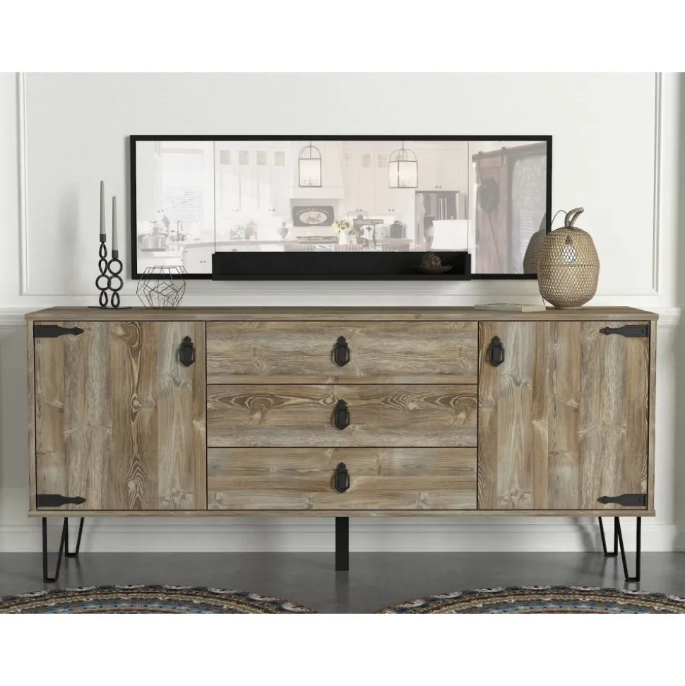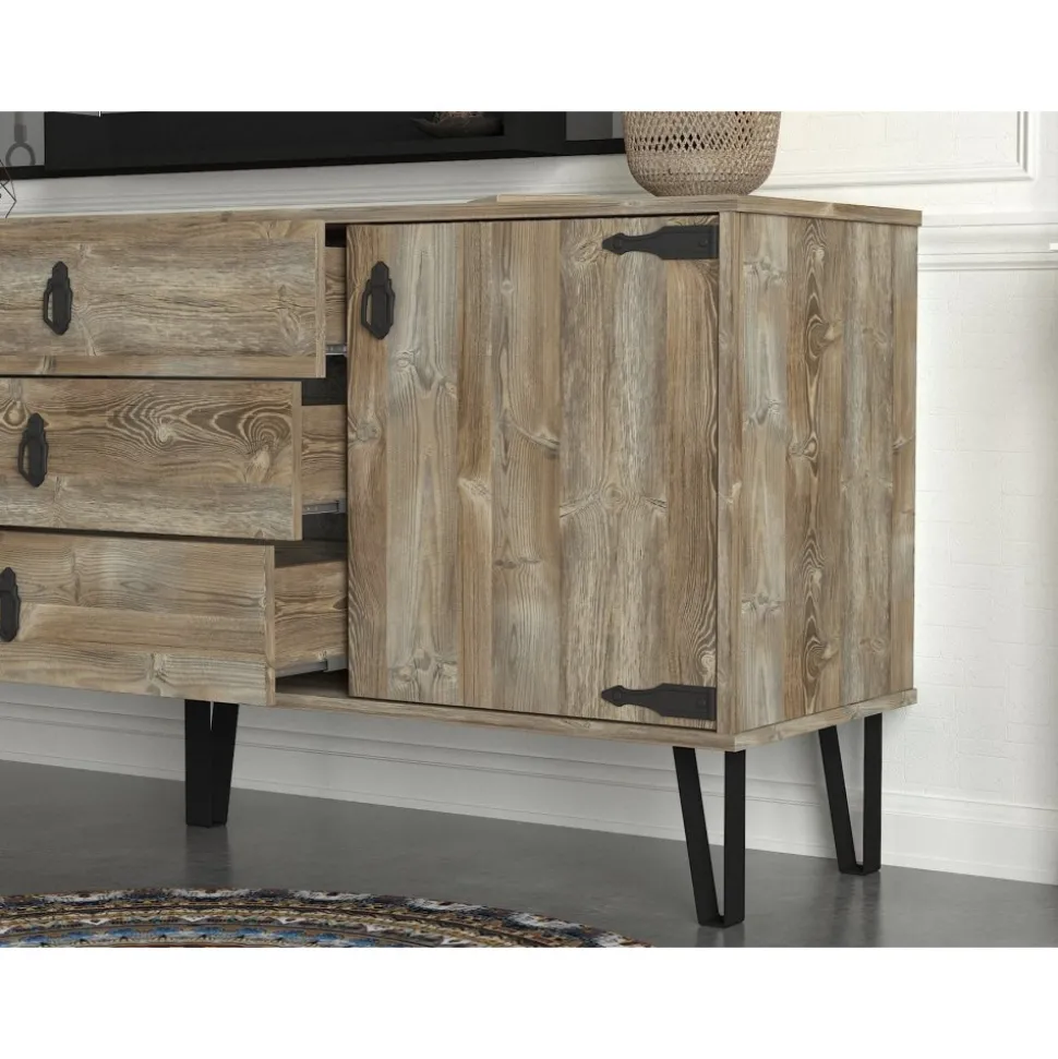 Skänk av melaminbelagd spånskiva. Ben av metall.