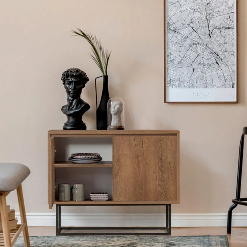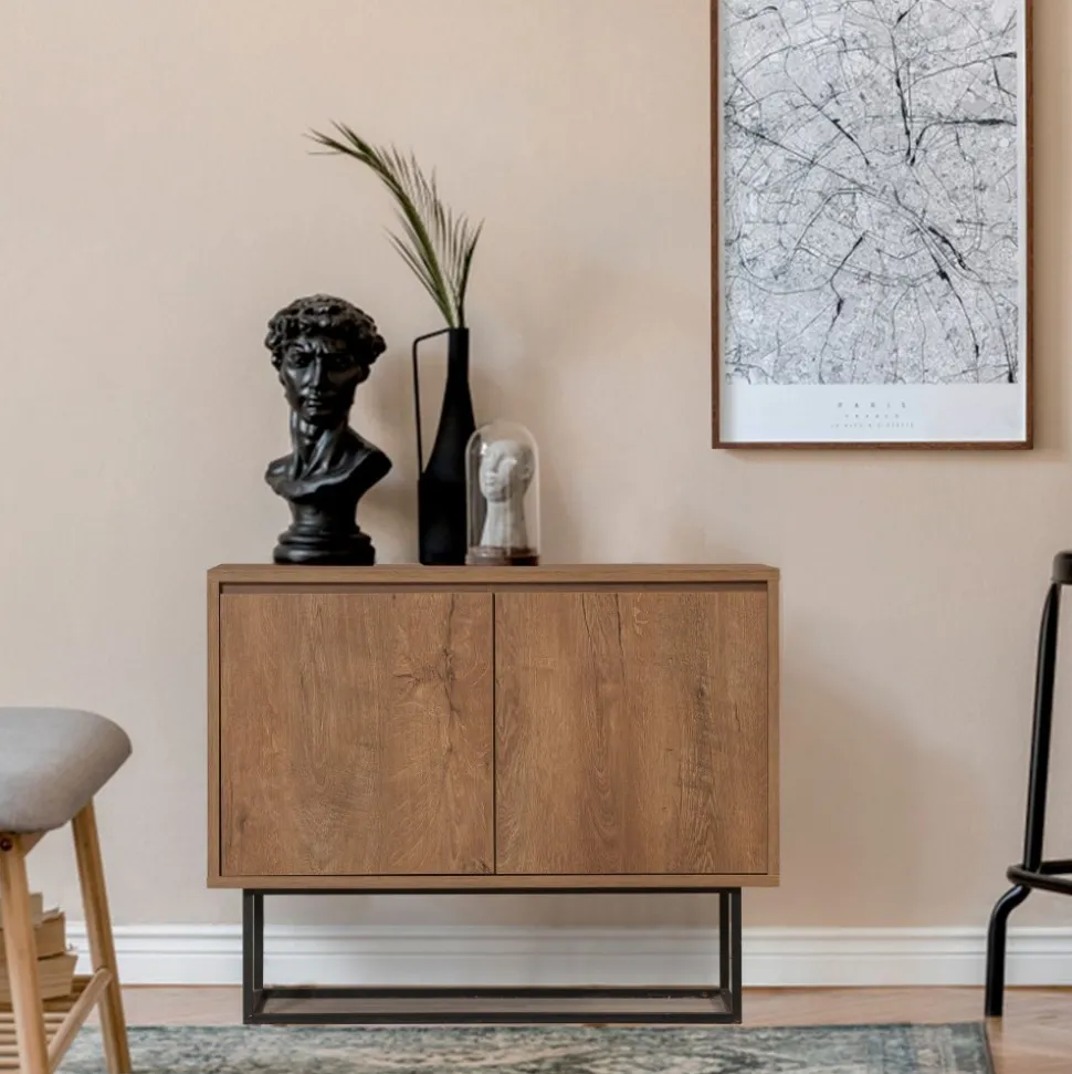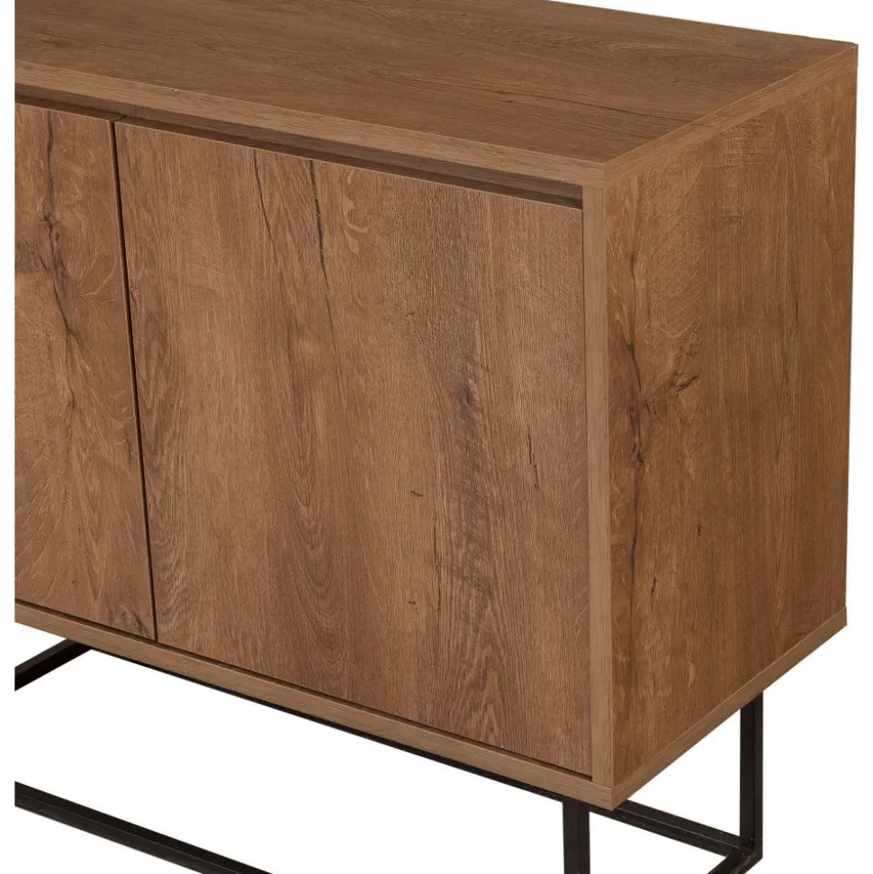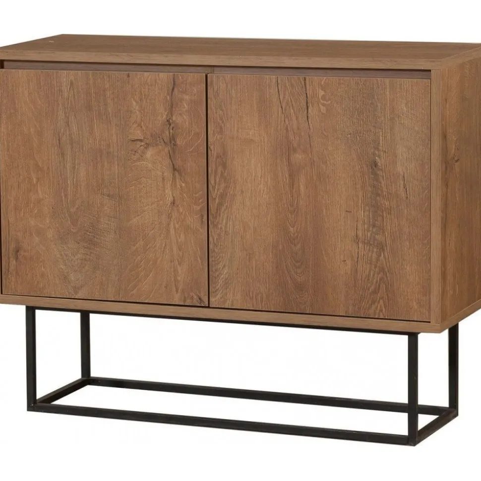 Modern skänk i vintage stil. Skänken är tillverkad i melaminbelagd spånskiva i valnötsliknande utförande. SKänken har två lukor på framsidan med bra förvaring som döljs av de stängda luckorna. Skänken står på en ställning i svartlackad metall som skruvas fast i skänken.