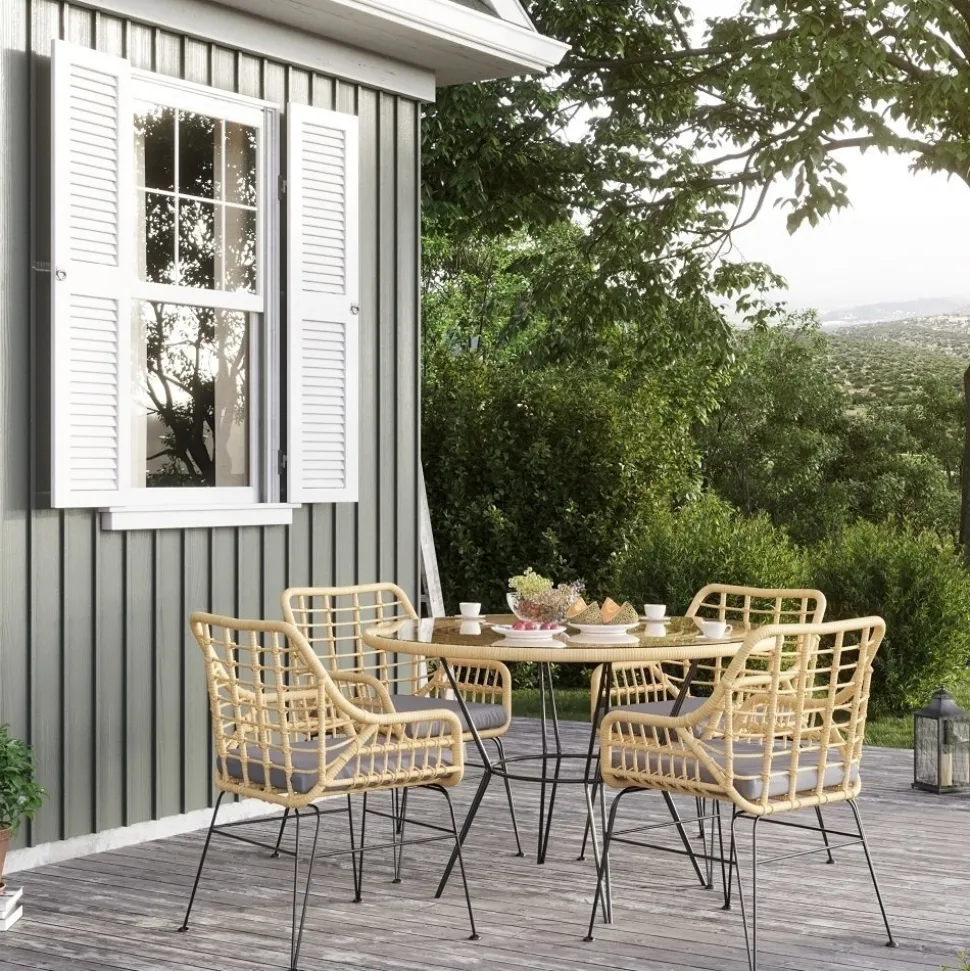 Klassiskt utebord runt , Ø120 cm i diameter. Toppskiva i glas med rotting detaljer på bordet och stomme i svbart metall.