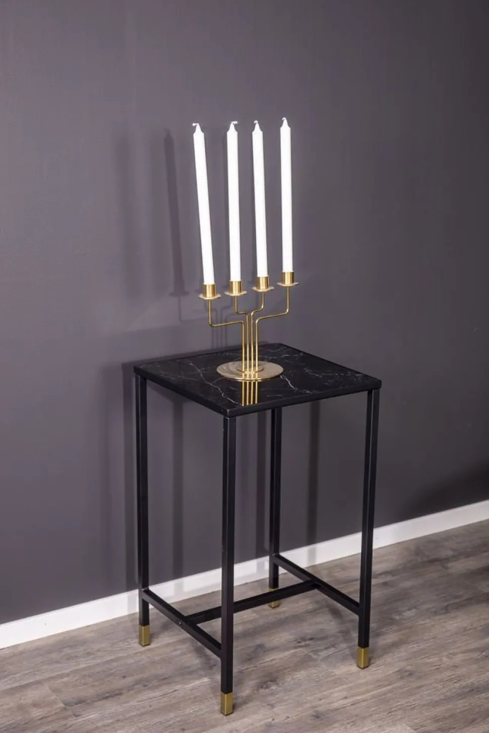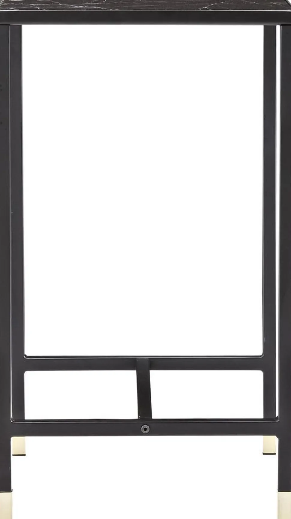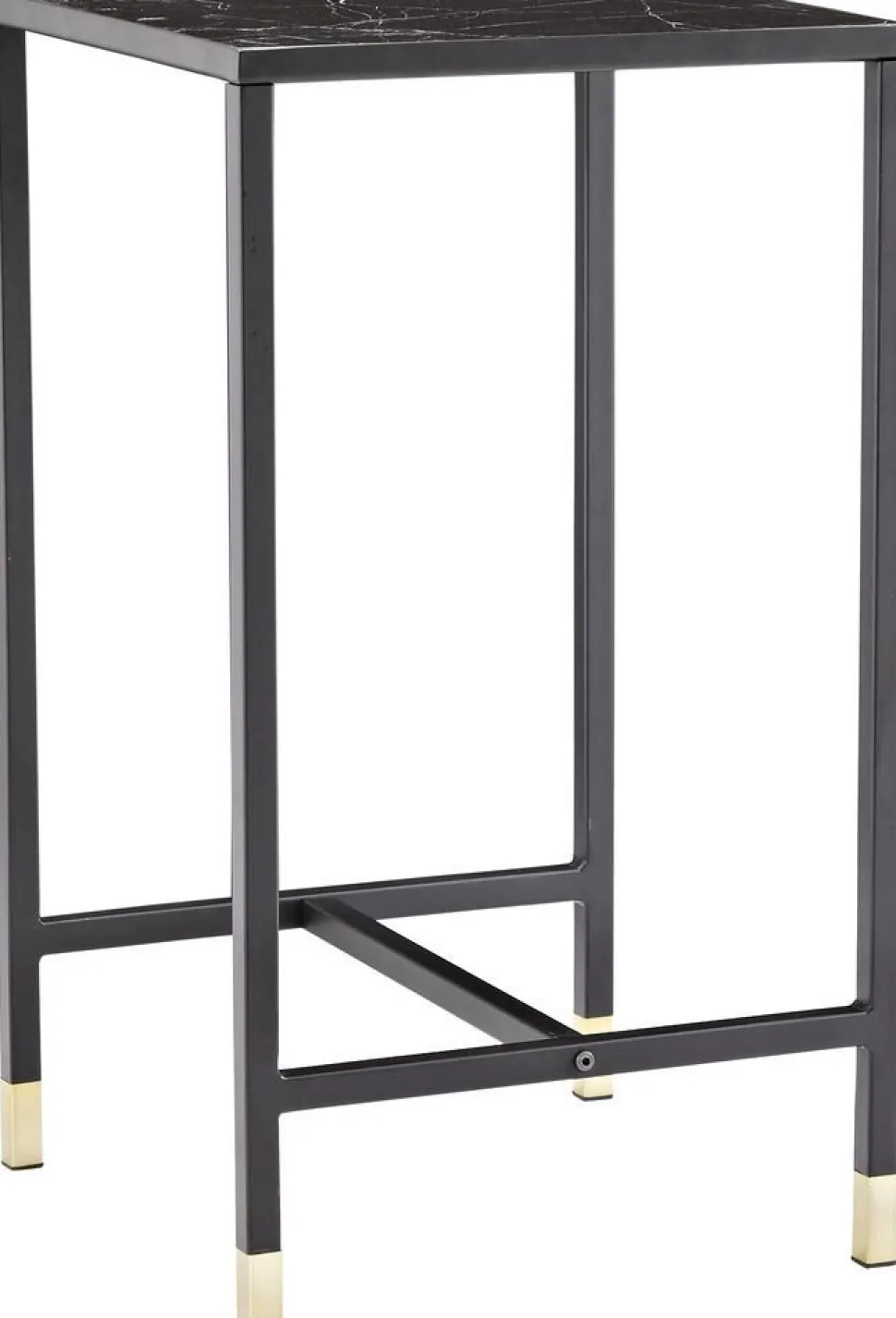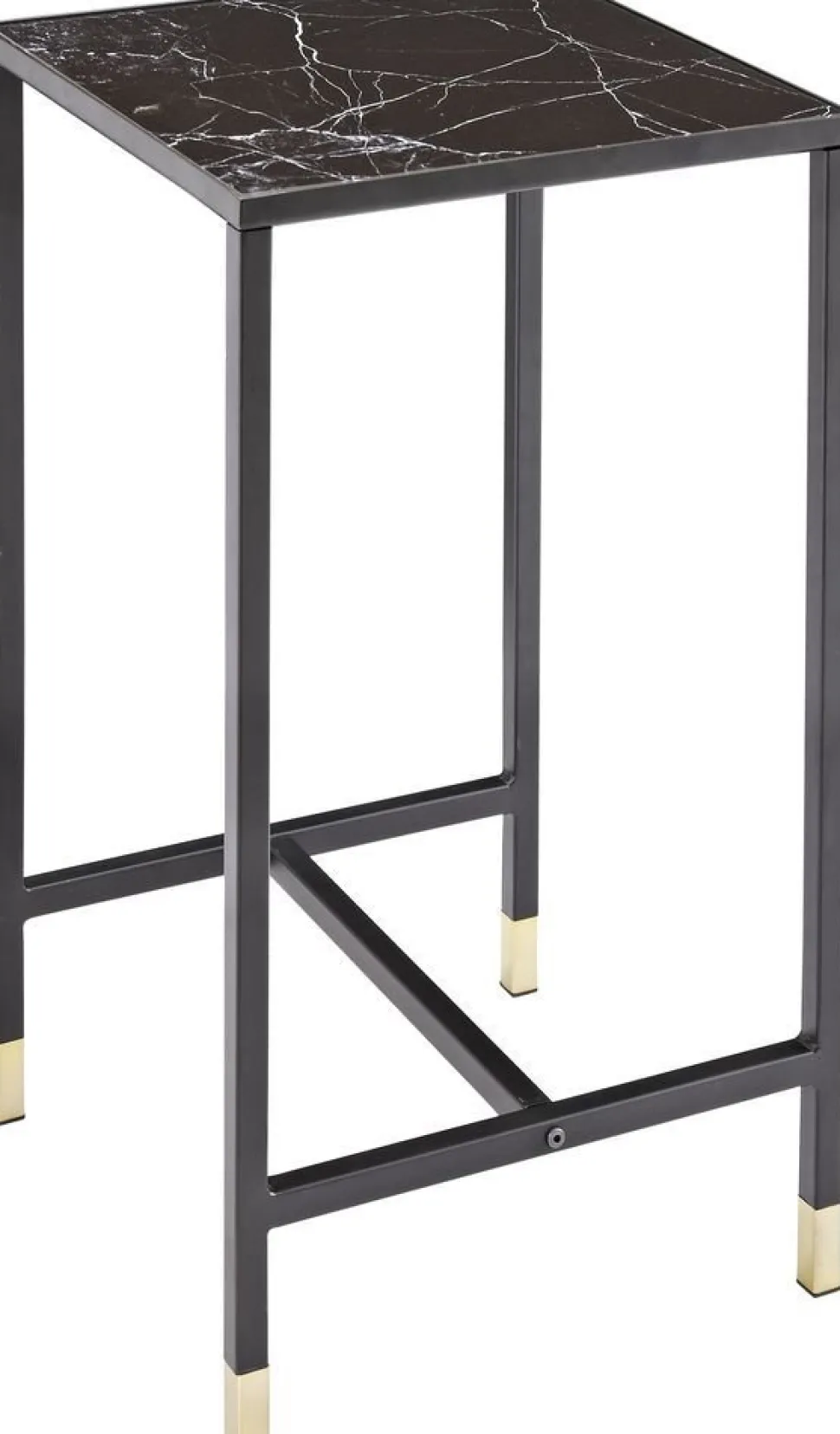 Sängbord med svart mönstrad glasskiva och underrede i svart metall. Detaljer i mässing nertill av benen.