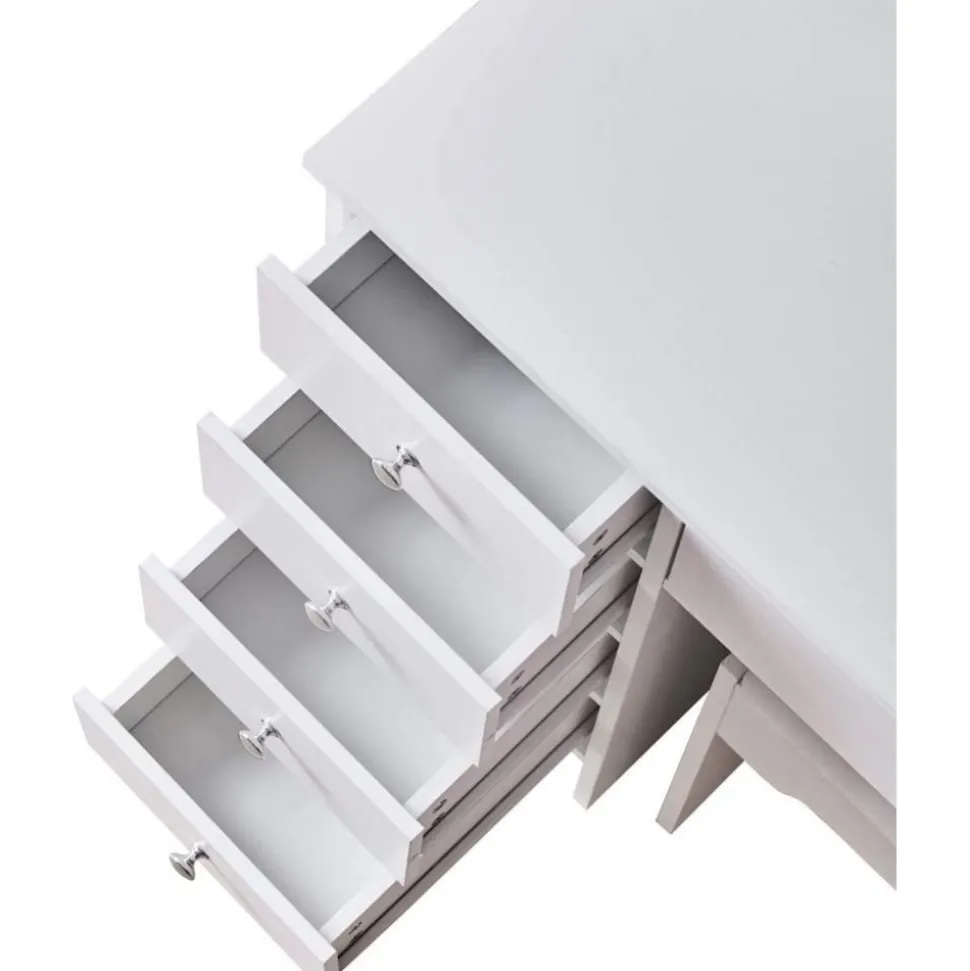 Bordet har 5 st utdragbara förvaringslådor och 4 st öppna förvaringsfack. Ännu mer förvaring finns bakom spegeln som går att skjuta åt sidan. Pall med klädsel av bomull ingår.