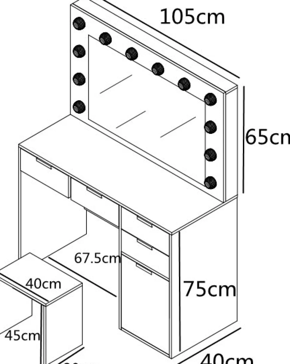 Sminkbord tillverkat av hållbart trä med en vit yta som ger en fräsch och modern känsla som passar in i alla typer av inredningar. Utrustad med 12 stycken LED-lampor som ger ett klart och justerbart ljus, vilket gör det enkelt att se och applicera makeup även i svagt ljus. Bordet har 4 praktiska förvaringlådor samt ett skåp, vilket ger gott om utrymme för dina sminkprodukter, borstar och andra skönhetsartiklar. Håll ordning och struktur i ditt skönhetsutrymme. En pall med klädsel av bomull ingår, vilket ger komfort och stil. Pallen harmoniserar med bordets design och gör det enkelt att sitta bekvämt medan du fixar dig.
