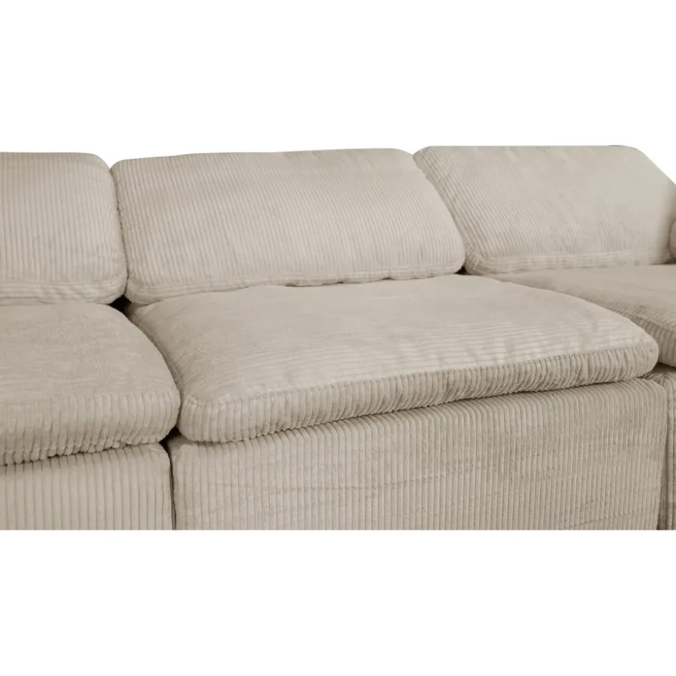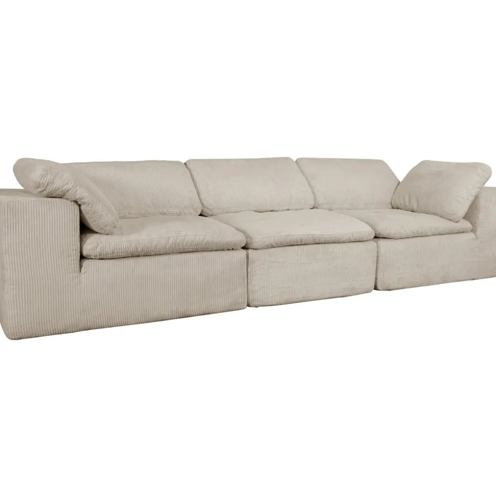 Vera 320 cm lång och 110 cm djup. Soffa i beige manchester. Modern med 30 cm breda armstöd.