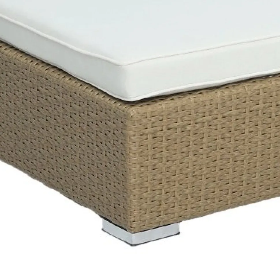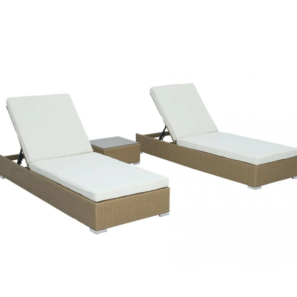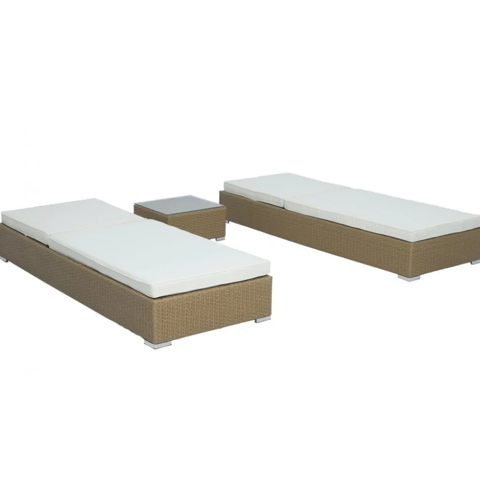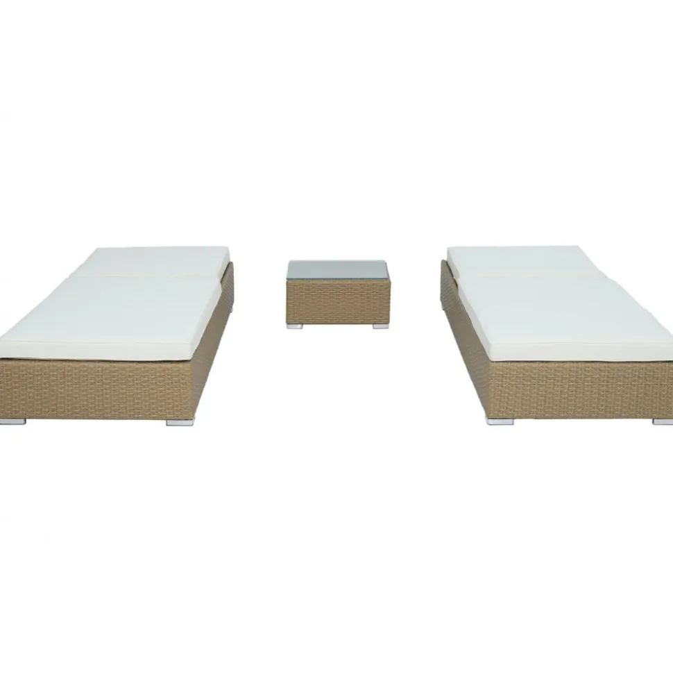 Set bestående utav 2 st solsängar i naturfärgad konstrotting med ljus dyna dynor i polyester. Tyget är vattenavvisande och tåligt. Övre delen av solsängen är ställbar i fem lägen, perfekt för att exempelvis läsa samtidigt som man njuter av solen. Ingår gör även ett litet bord i matchande konstrotting, 5 mm toppskiva av glas. Ben av metall.
