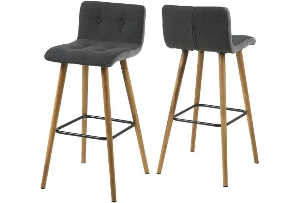 Stilig barstol, klädd med mörkgrått tyg och ljusgrått på sidorna med benen är gjorda av oljebehandlad massiv ek och har fotstöd av metall. Stolen ingår i vår Springfield serie.