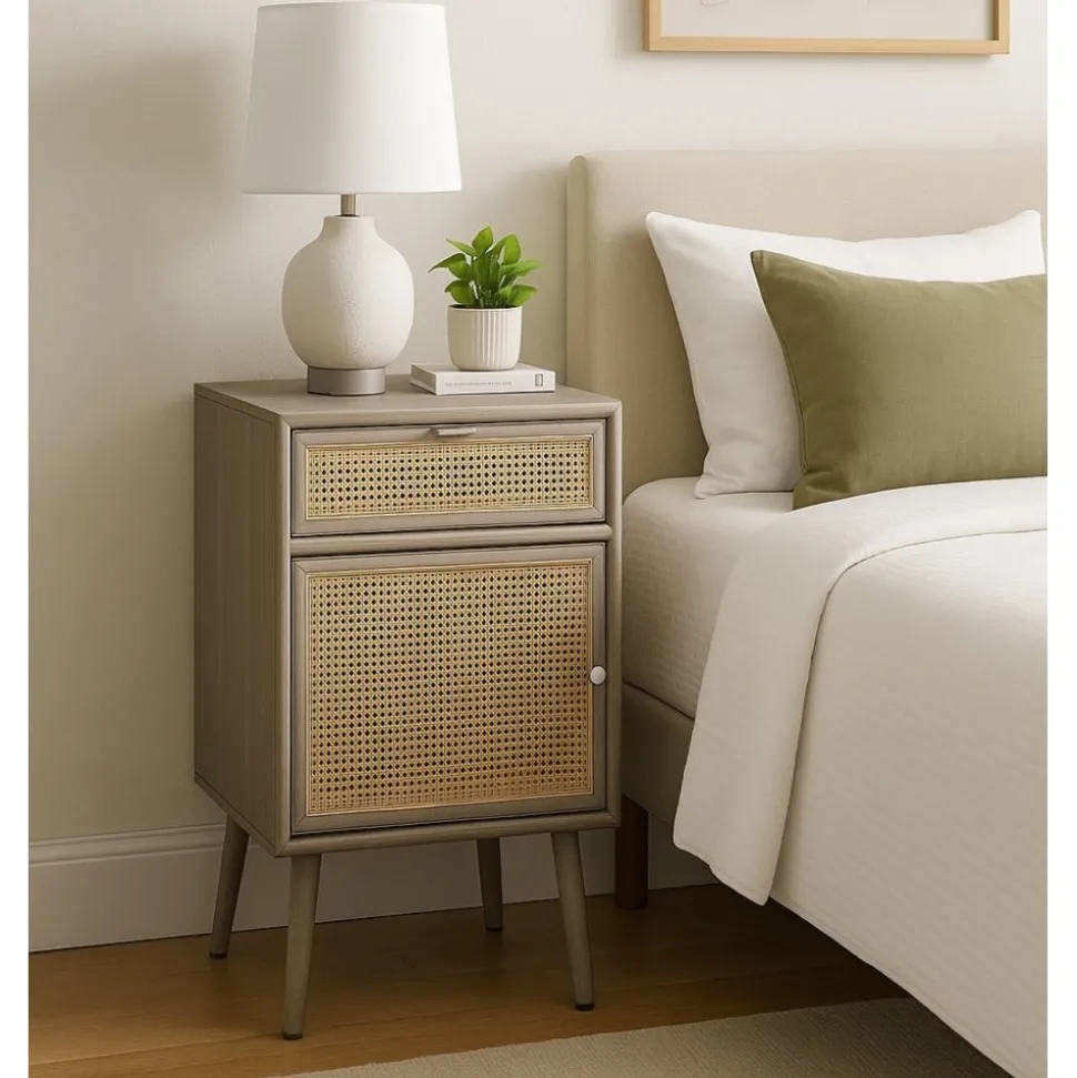 Stockholm i vintage grå med fronter i ljus rotting är en utmärkt kombination av stil och funktionalitet. Designen på sängbordet ger en sofistikerad och tidlös känsla, vilket gör det till ett perfekt komplement i sovrummet. Den vintage grå färgen erbjuder en mjuk och neutral ton som lätt kan integreras med olika inredningsstilar, från skandinavisk minimalism till mer bohemiska och rustika inredningar. De ljusa rottingfronterna tillför en textural kontrast som ger en varm och naturlig känsla, vilket ger sängbordet en unik karaktär.