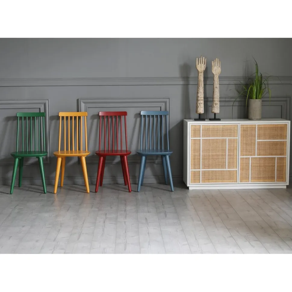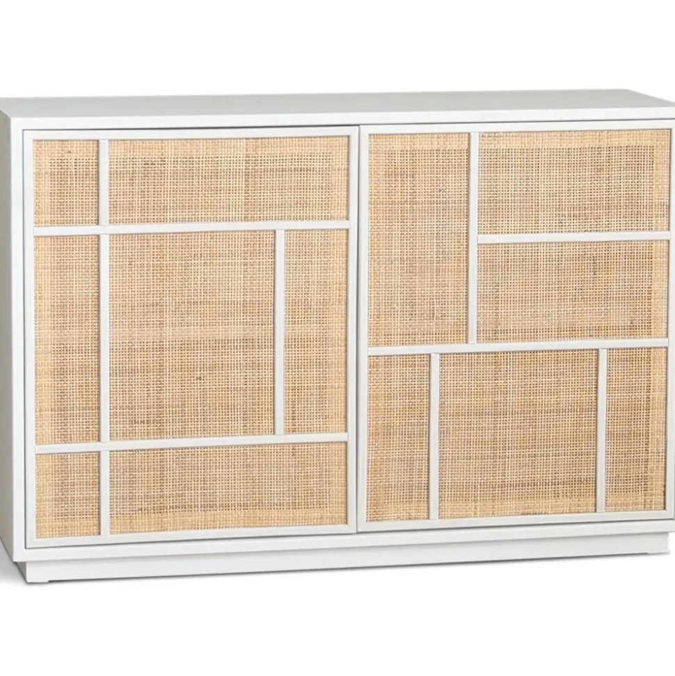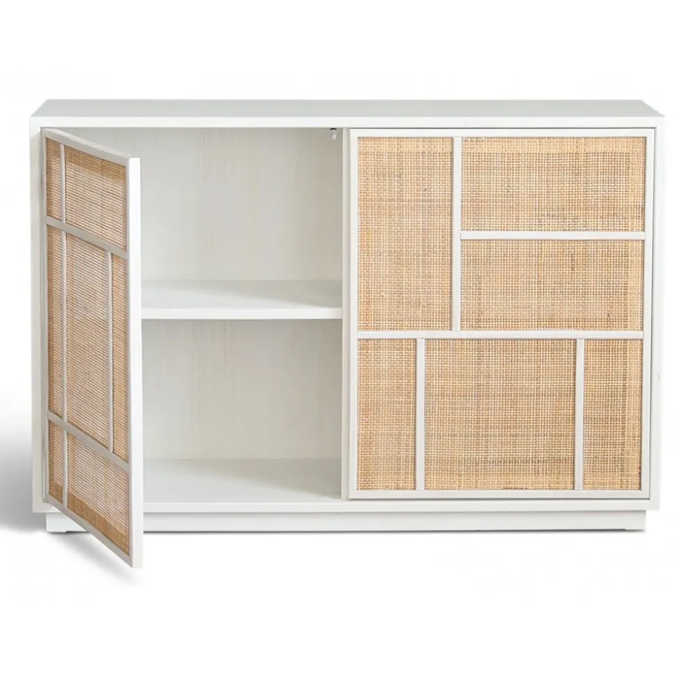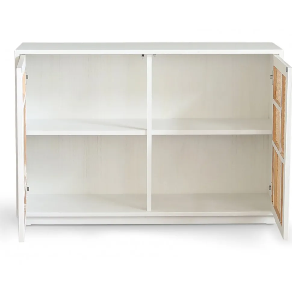 Stockholm sideboardet i vitt trä med fronter i ljus rotting. Sideboardet innehåller två fasta hyllplan. Detta har bra förvaringsmöjligheter.