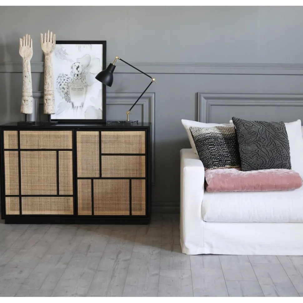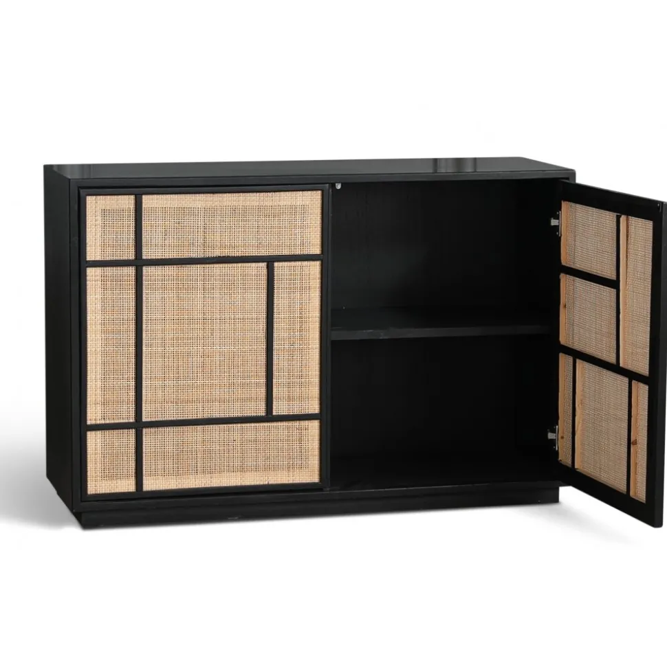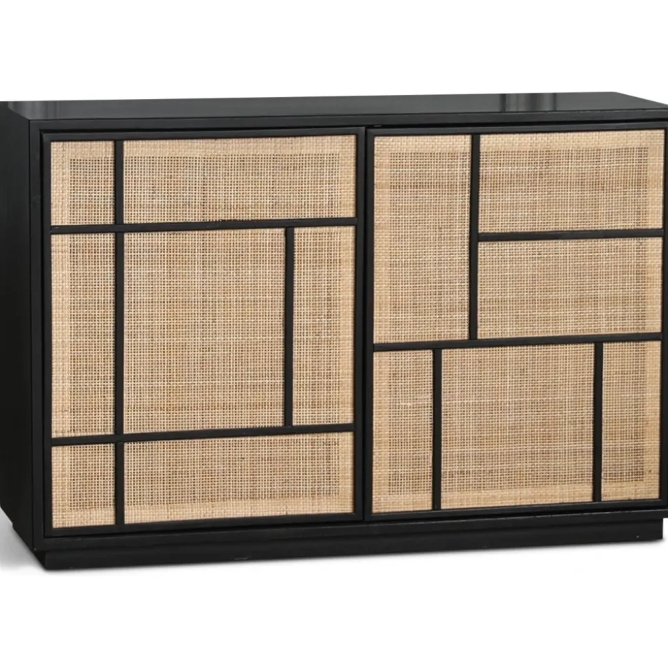 Stockholm i svartlackat trä med fronter i rotting. Sideboardet har två hyllor. Detta sideboard har bra förvaringsmöjligheter och en trendig design.